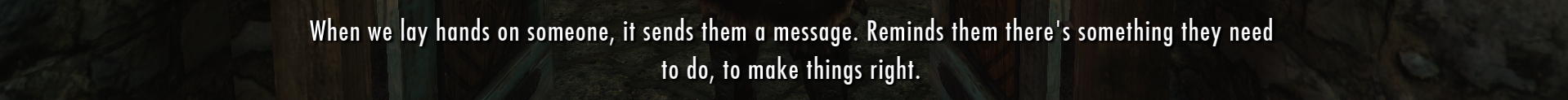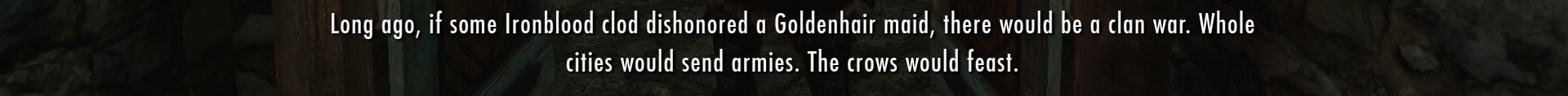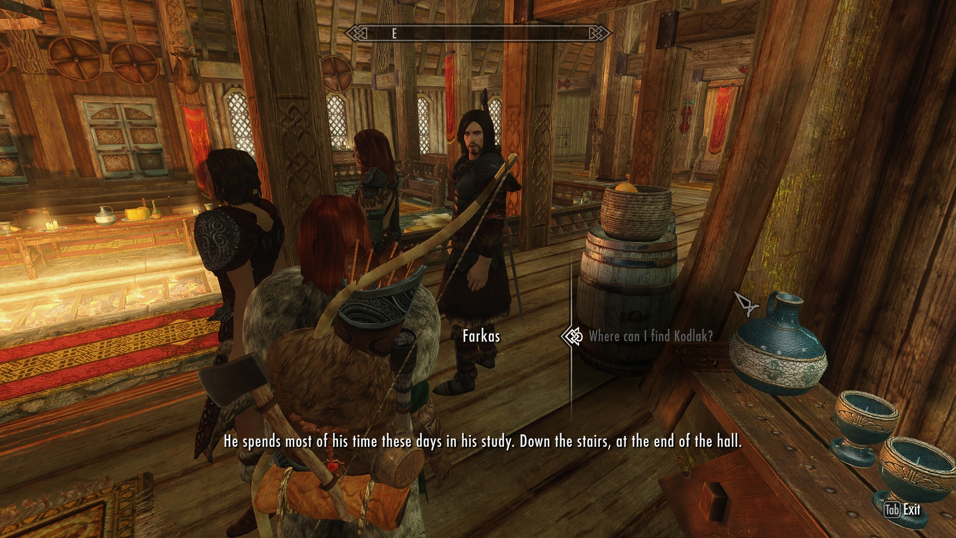 There’s indeed a fight going on between two other Companions, but I’m way too distracted to pay much attention. I manage to blurt out something about Kodlak, and Farkas tells me where I can find him. I stumble past him and down a set of stairs, noting that for a mead hall, the place is actually quite clean and pleasant. I can tell it’s also old, definitely older than my tavern back in High Rock. The wood is rich and golden, the furniture is well-worn and polished, and the carpets are faded but still elegant. Whatever else, this hall has stood here for a very long time, and it’s been cherished through the years with pride.