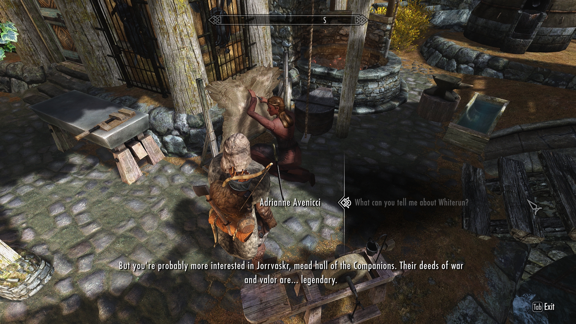 The Evil Twin (a.k.a. Vilkas) tells me to take his sword up to their personal blacksmith to have it sharpened. Despite his lofty tone, I can sense that I’ve gained his respect. I just passed his little test — and won our battle of wills — so I can be gracious. We’re on the same side, now.
