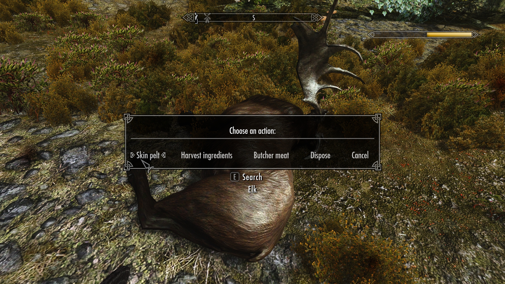 Right. I’m supposed to field butcher this or something. I sure can’t drag it all the way back to Whiterun, and I doubt the guards would let me through the gates with a torn-up bloody moose corpse. I guess I’ll have to, what, skin it? Pretty sure there’s more to it, though. Great. Just great. I’m exhausted but it’s plain my work has just begun.