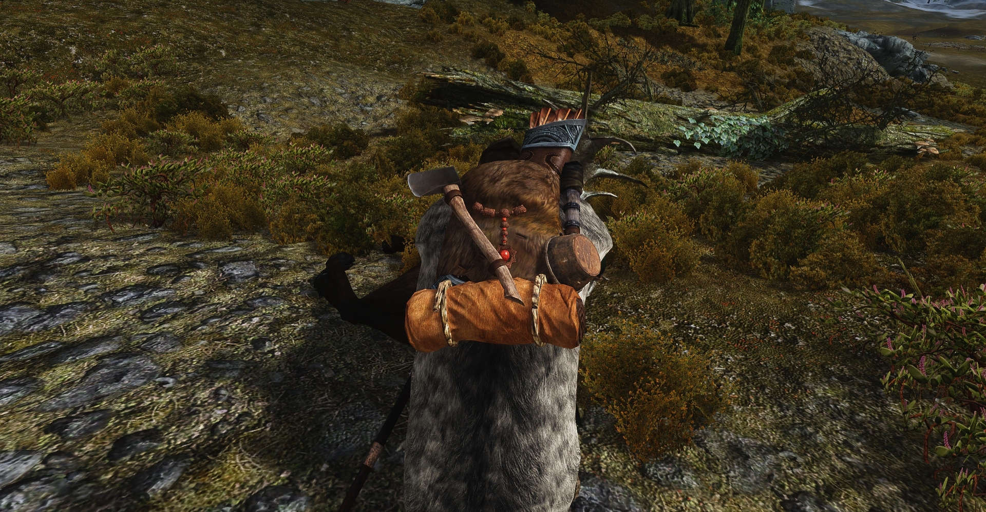 Finally I’m ready to butcher the meat and cut up the bigger chunks for transport. This takes the longest of all. When I’m finally finished, I’m hot, filthy, covered in blood and moose hair, and it’s getting dark already. Wearily I dispose of the emptied carcass and most of the bones, leaving them under a tree for the wolves to gnaw, and I make my way back to Whiterun as the sun sets.