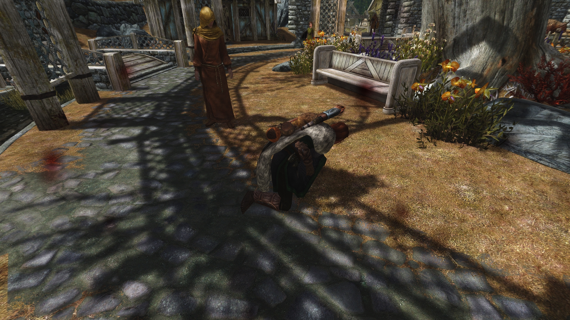 Great, now I’m probably cursed for life. Kynareth, the supreme goddess of the sky, isn’t going to look too kindly on someone beating the snot out of one of her chosen servants. What kind of lame assignment was this anyway?! I excuse myself and head straight back to Jorrvaskr. Farkas and I need to have a little talk.