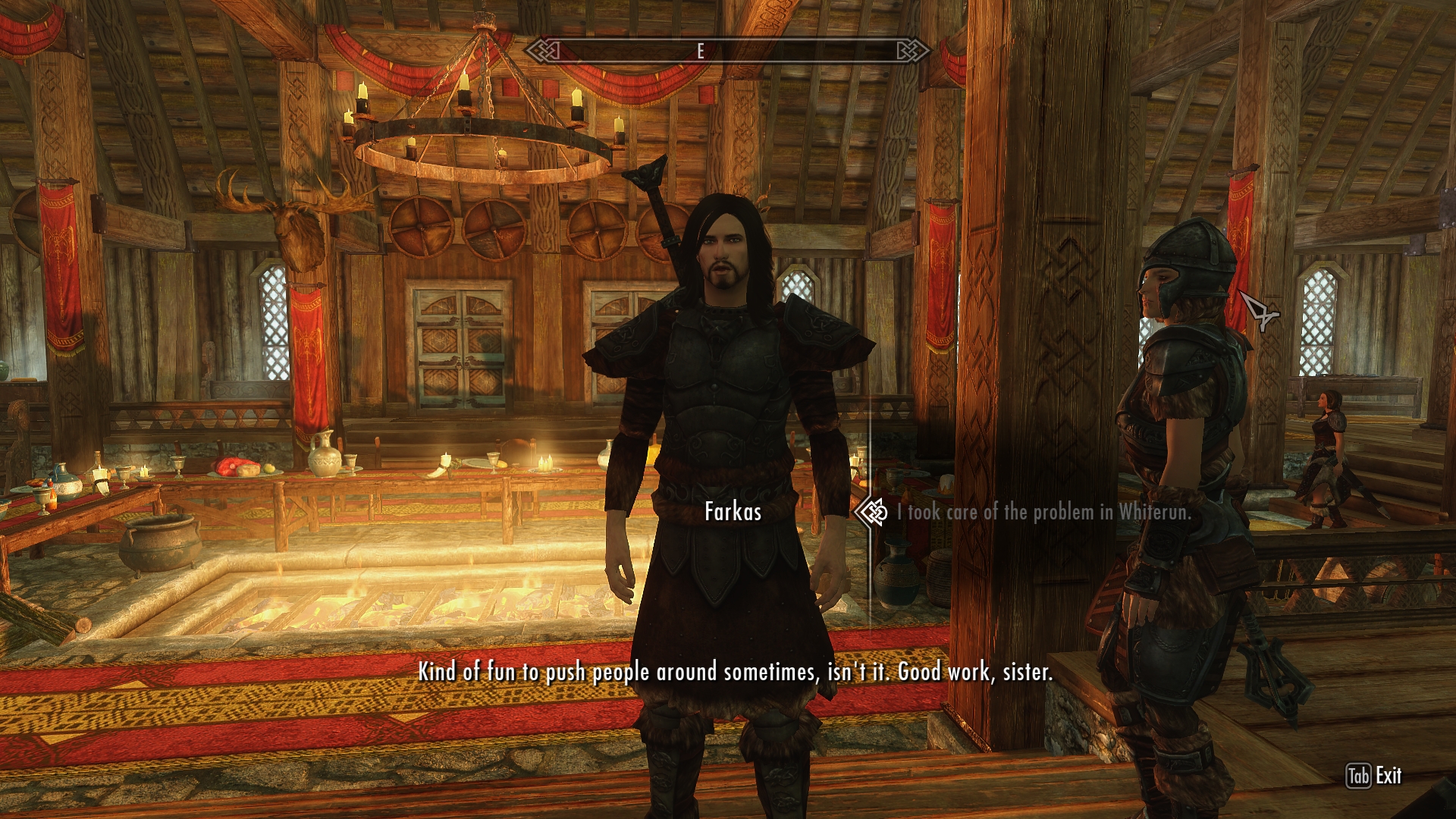 Before I turn in, Farkas offers me some work for the following day: intimidate someone who’s been causing trouble in Whiterun. He doesn’t get more specific than that, other than to tell me the name of my target. Naturally it’s someone I haven’t met, so I pretty much know nothing else. I accept the job, of course. Wouldn’t do to refuse my very first assignment (especially in front of Farkas!) and it seems I have to build some status with the Companions before I’m considered to be one of them. I might be in, for now, but it’s apparent I’m on trial.