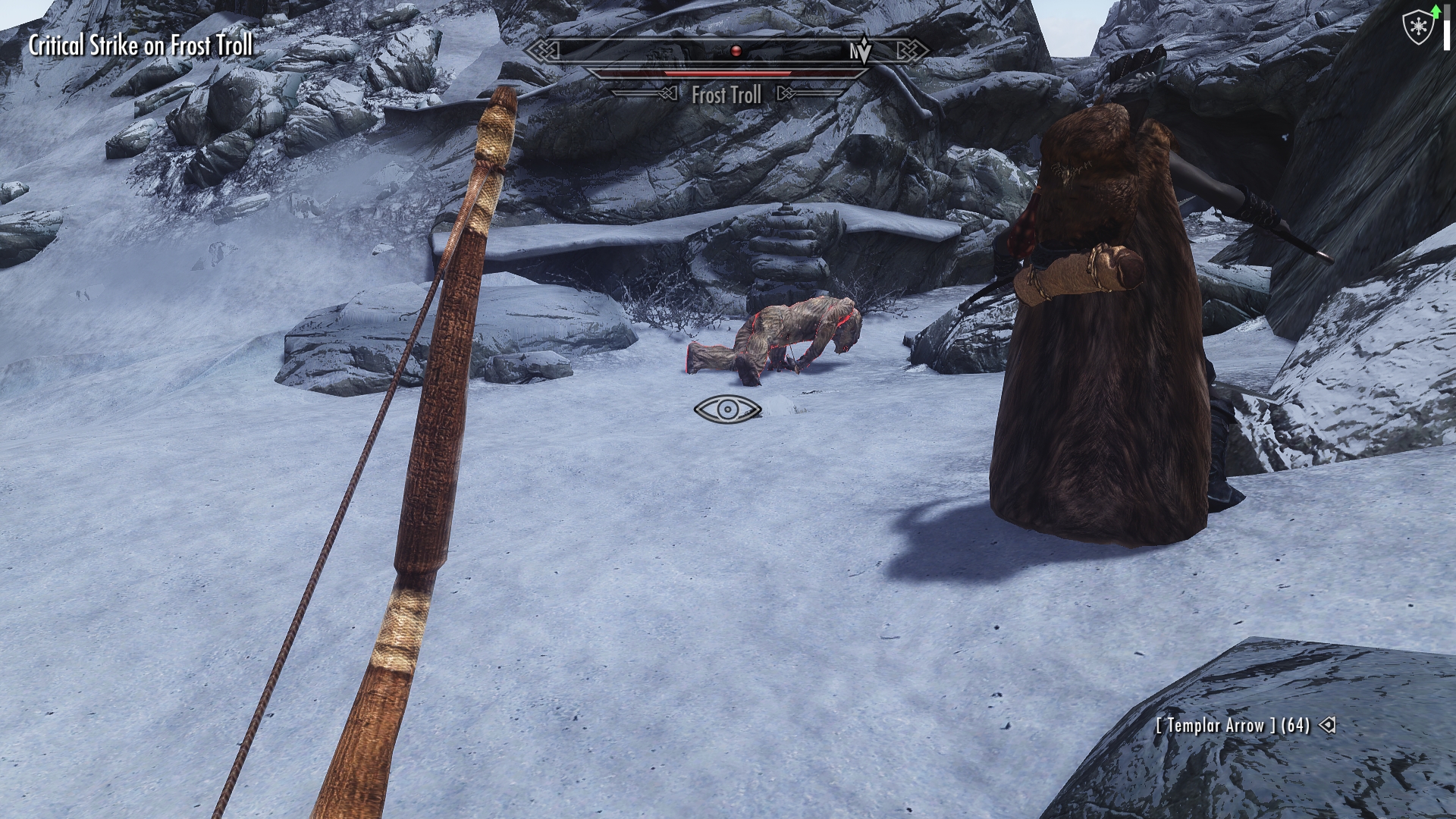 The paralysis poison works instantly. The frost troll drops like a rock from the cliff and bounces off the stones. I fire at the beast nonstop but I don’t get a lot of shots off in just three seconds. Pretty soon the effects wear off and the troll rises to its knees. Hmm, y’know, I think it might have spotted us.