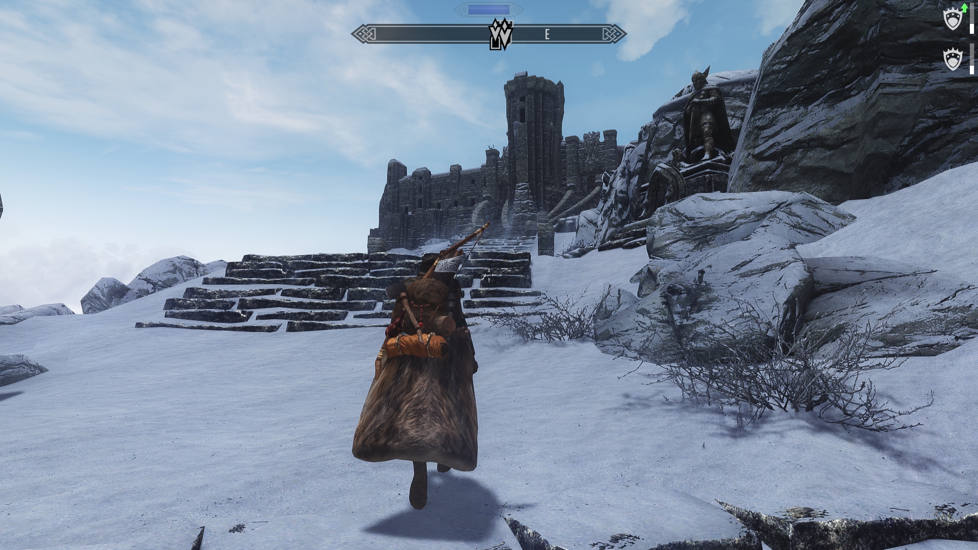 Finally we seem to be arriving at our destination, and not a minute too soon. The warmth of the campfire behind us seems like a distant memory, and there’s a definite increase of empty mead bottles. The wind cuts like a knife and there’s a light sheen of frost forming on my furs. I’m sure the Greybeards have a reason for living on top of this frozen rock. I’m assuming it’s because they’re masochists.