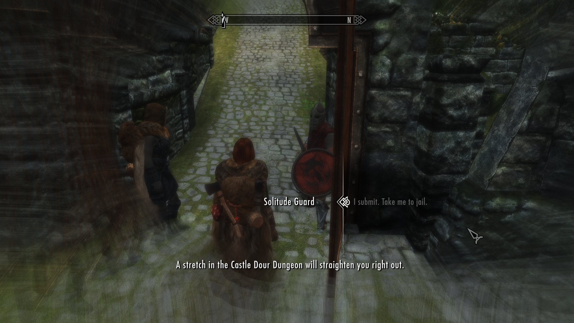 Jenassa tries her best to get me off the hook, even blaming herself for letting me leave the tavern in my drunken state, but the guards aren’t really listening. I’m not about to have her take the heat for me, so I step shakily toward one of the guards and turn myself in.