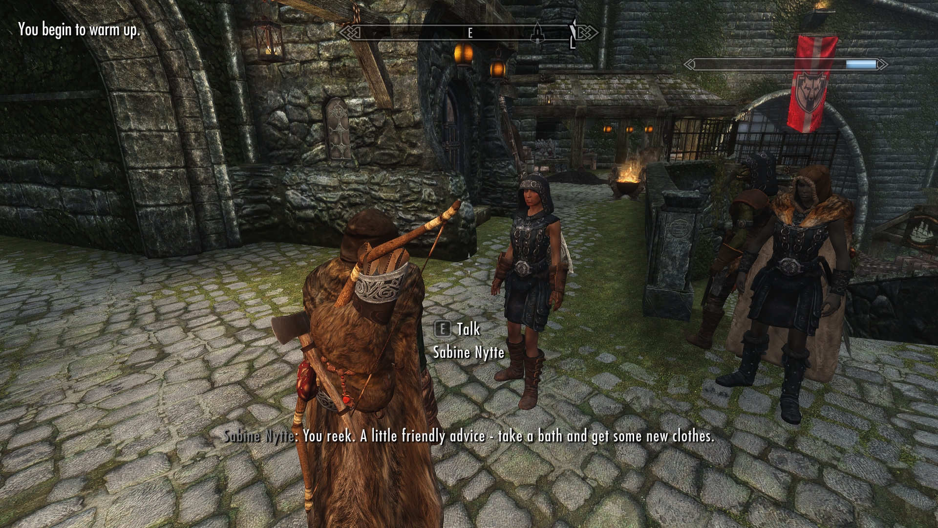 Or wait, maybe there’s a crypt. So I should look for a crypt instead. Hang on — no, I was right the first time. I better find some graves. Or both. Or… y’know what, forget it. I’ll just walk down the street and I’m sure to find a priest somewhere. Solitude’s a big city with lots of people and there’s a war on. I bet people die every day around here. So this place should be full of priests! It’s perfectly rational. I confidently exit the Winking Skeever with Jenassa right behind me.