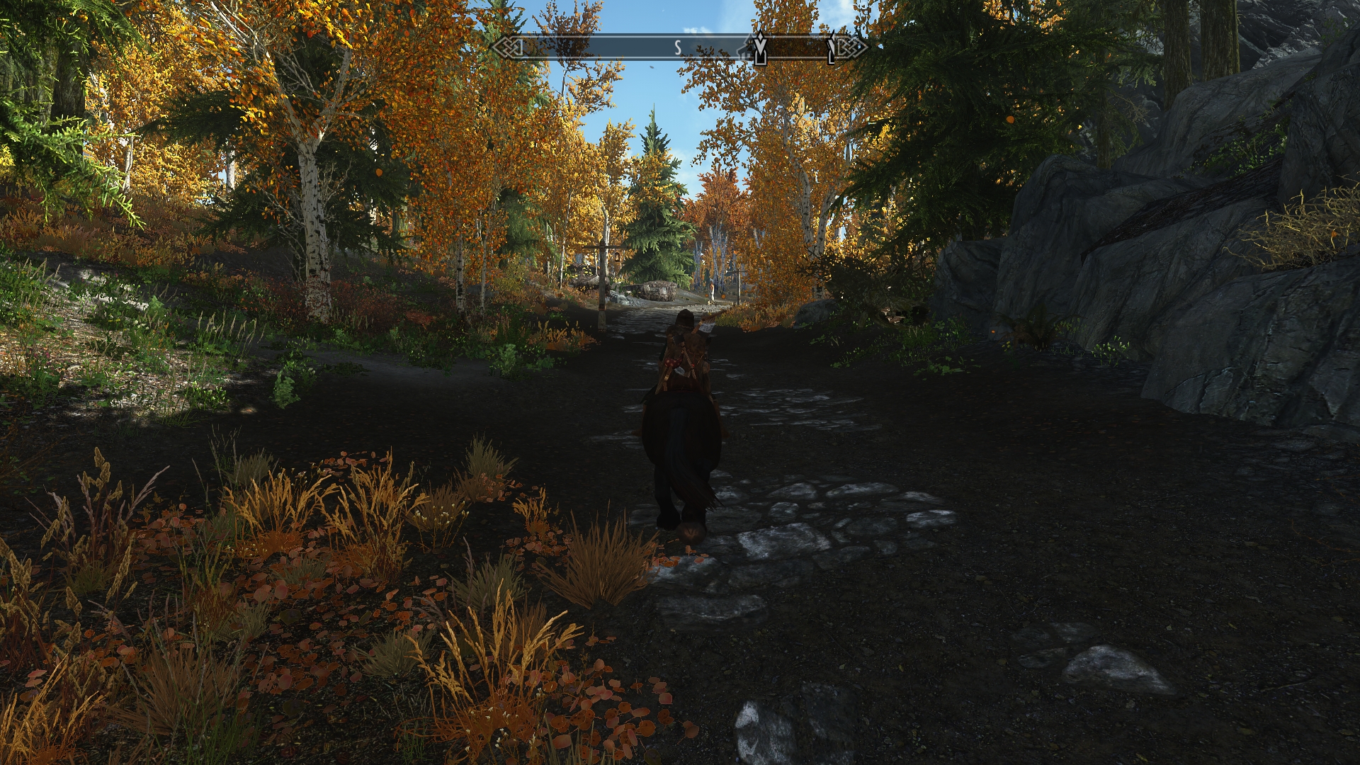 Jenassa and I ride out from Kynesgrove to pursue the task given to us by the Companions.  The sun is warm on our shoulders as we head toward Shor’s Stone, but it’s already past the middle of the day.   I’m hoping we can reach our destination before dark and find a decent place to spend the night — although we’ll likely have to settle for a campsite somewhere.