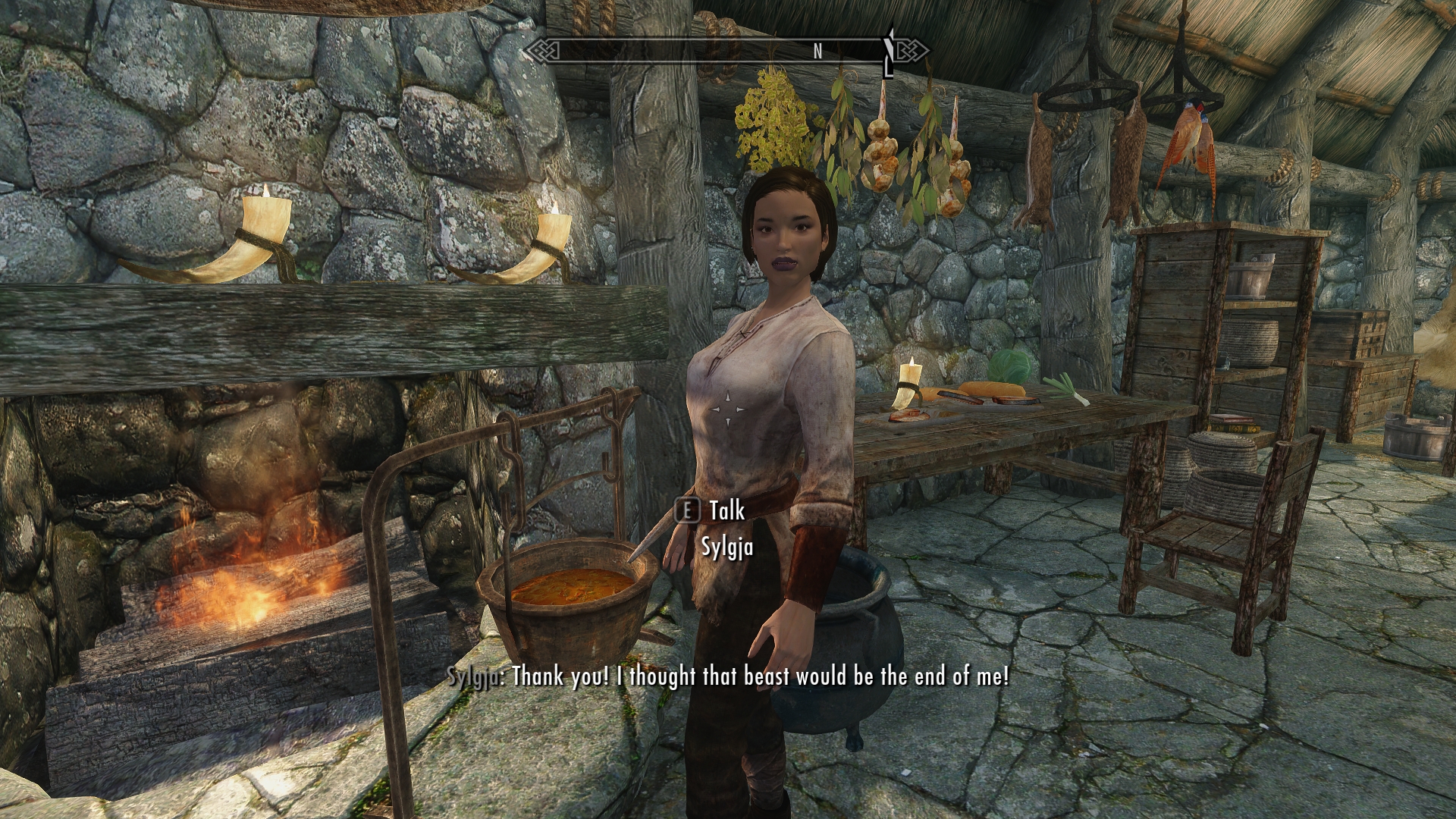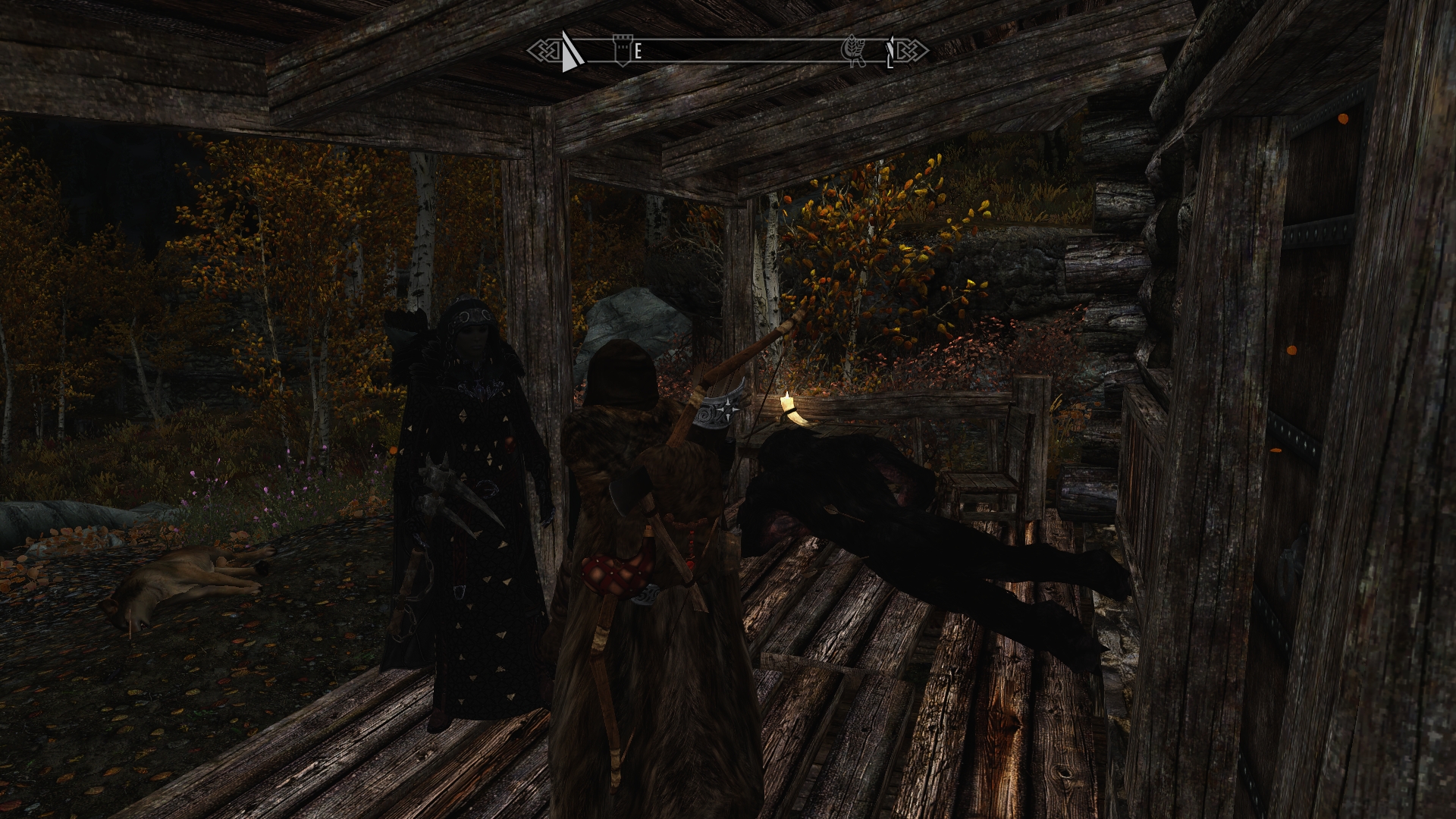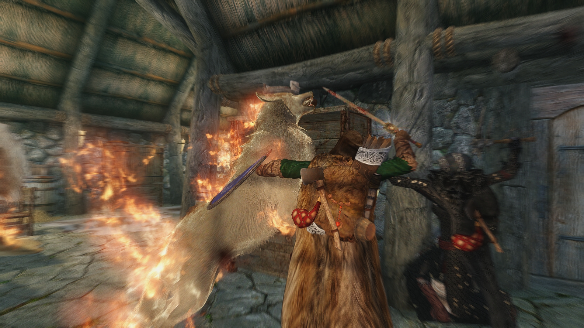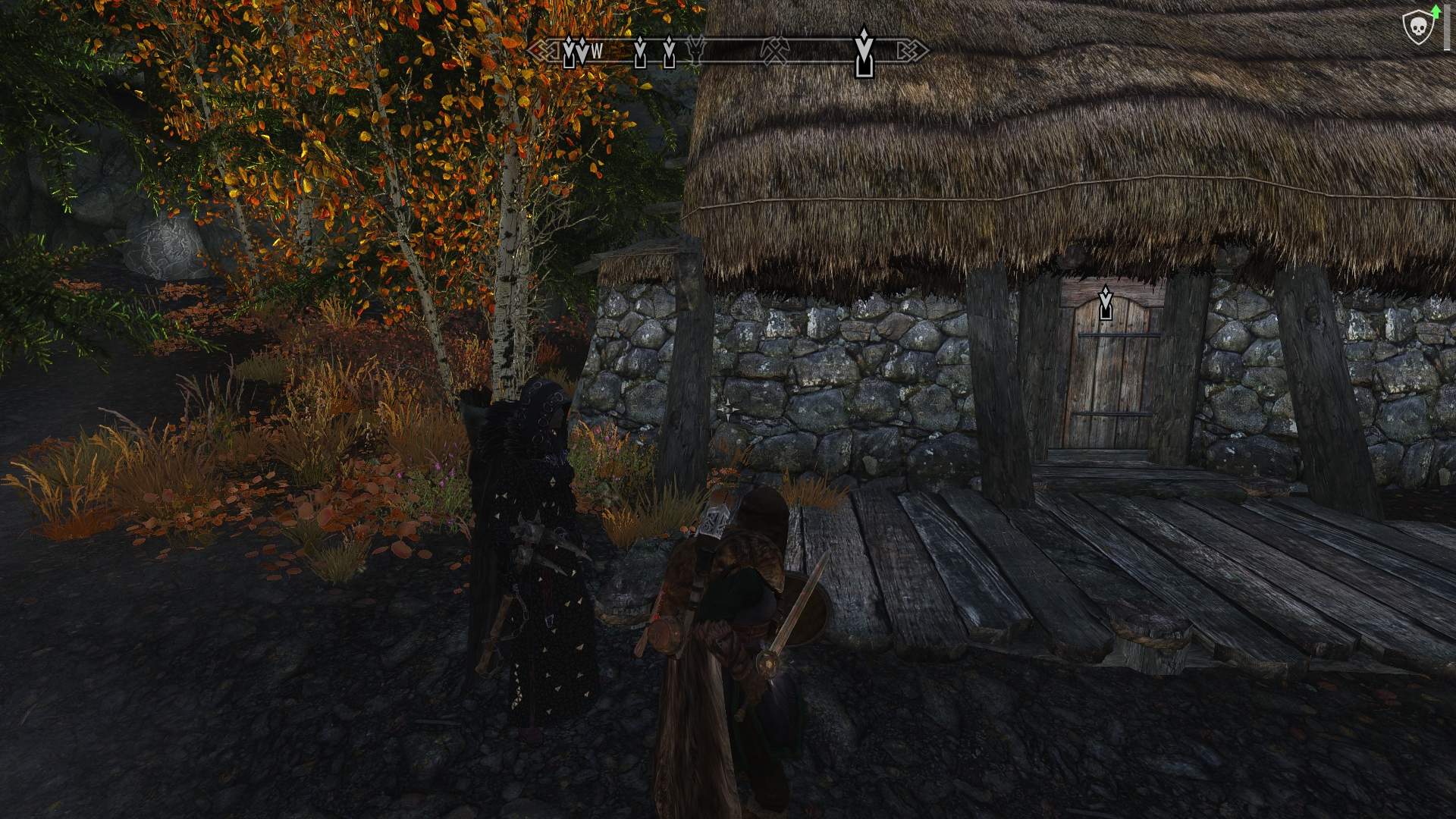 The house closest to the fire matches the description given to me by Aela, so we dismount and approach the door, drawing our weapons.  At least we can be reasonably sure we don’t have to deal with a troll this time… I hope.