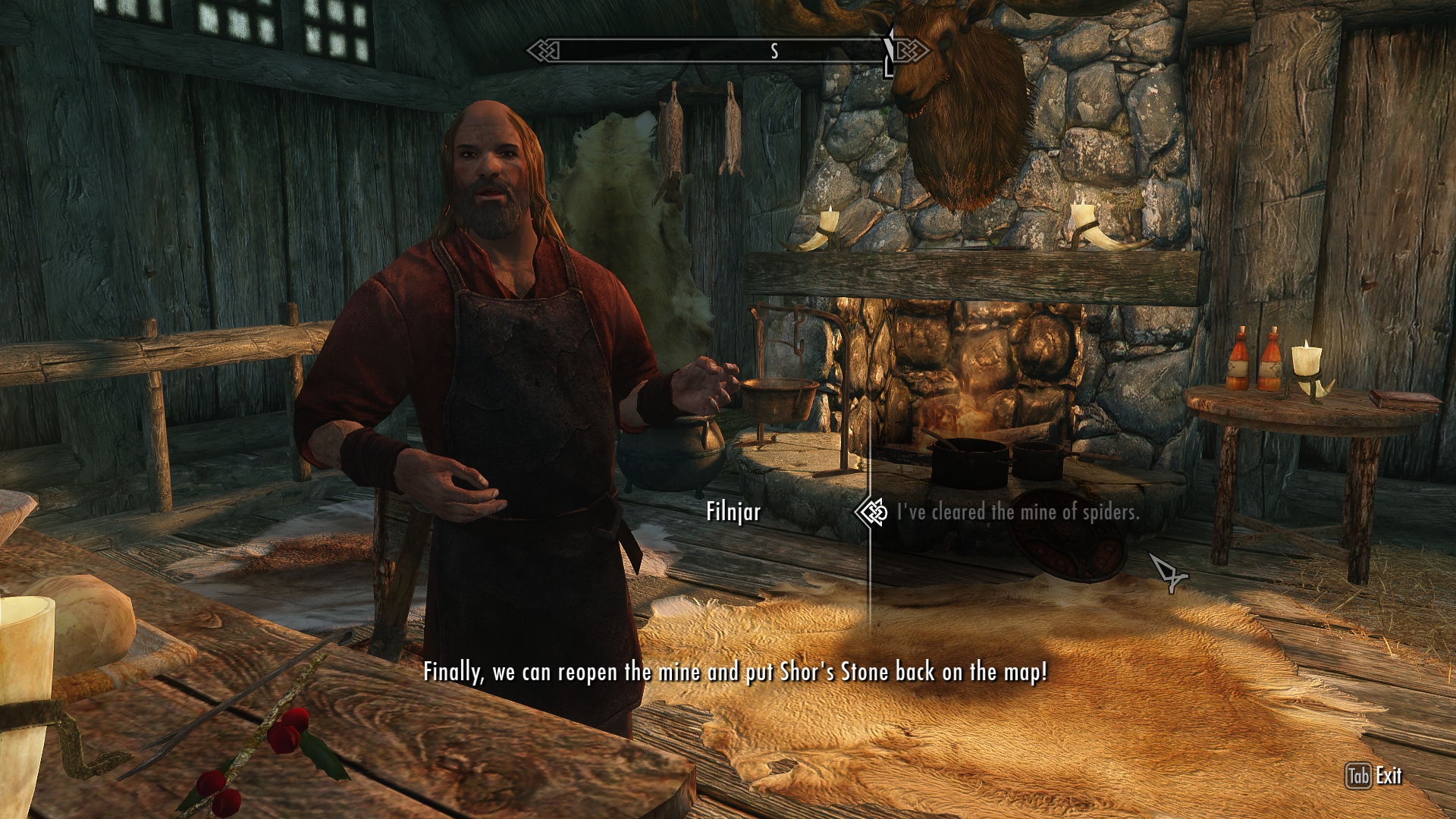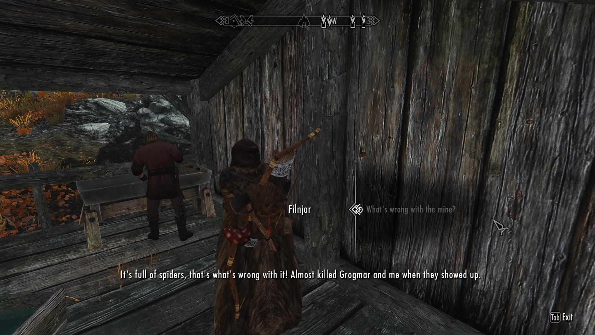 But when the war began, all that changed.  Rangers were recruited by both sides in order to fill the ranks with experienced archers and scouts, and the wilderness cabins were abandoned.  Riften sent guards to Shor’s Stone to help protect the mine after the rangers were drafted into the army, but now with the murders at the watchtower, there are only two or three guards left.  Their numbers are clearly inadequate to protect even this small village, given that a wild beast invaded someone’s home and spiders took over the mine.  In addition, there have been persistent rumours that bandits have taken over a nearby fortress.  The blacksmith is certain that it’s just a matter of time before Shor’s Stone falls to some combination of hostile forces.
