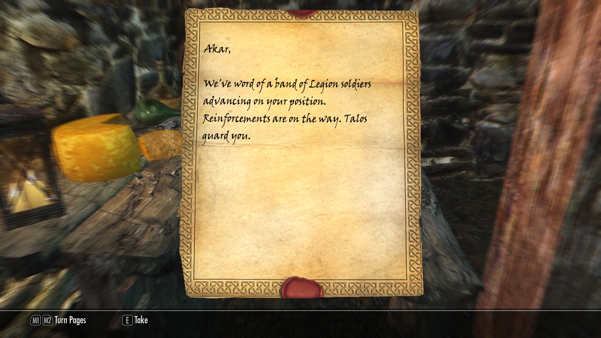 After we discover the bodies, we search the tower, looking for an explanation (and any worthwhile loot).   On a table near the entrance, we find a letter that seems to explain matters — although if this is accurate, then the guards are even more useless than the blacksmith said.