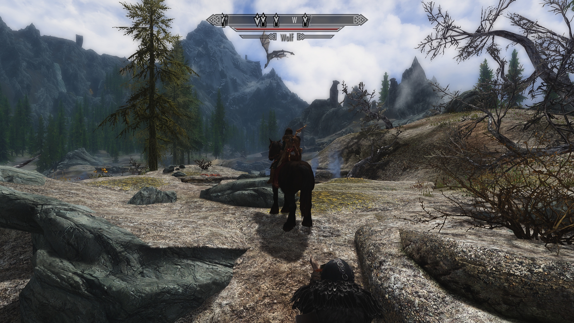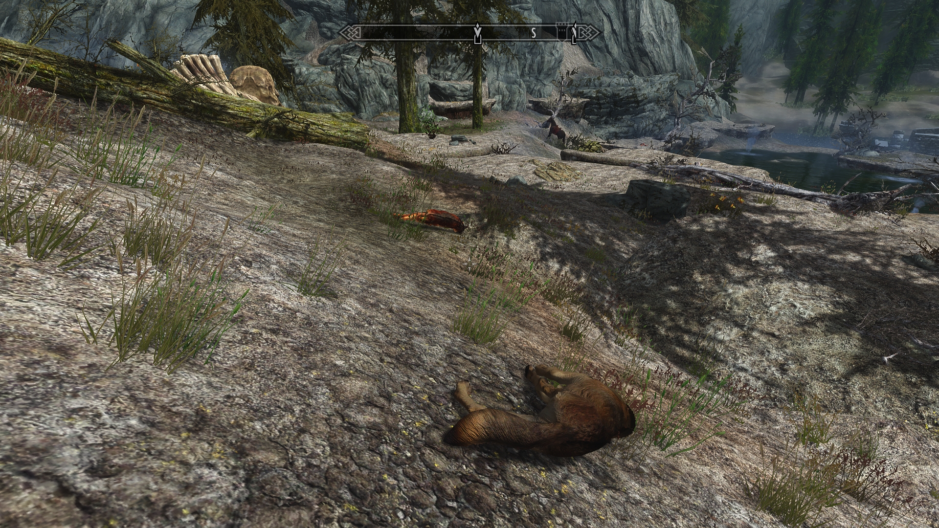 The ground is cracked and fissured with steaming vents that smell of sulfur, creating little pockets of mist.  Trees are sparse on this rocky soil, and the rest of the vegetation barely rises above the ground.  Unlike the dense pine forests of Falkreath, here we can see a fair distance all around us — but certain predators still have ways of blending into the surroundings before they decide to ambush.