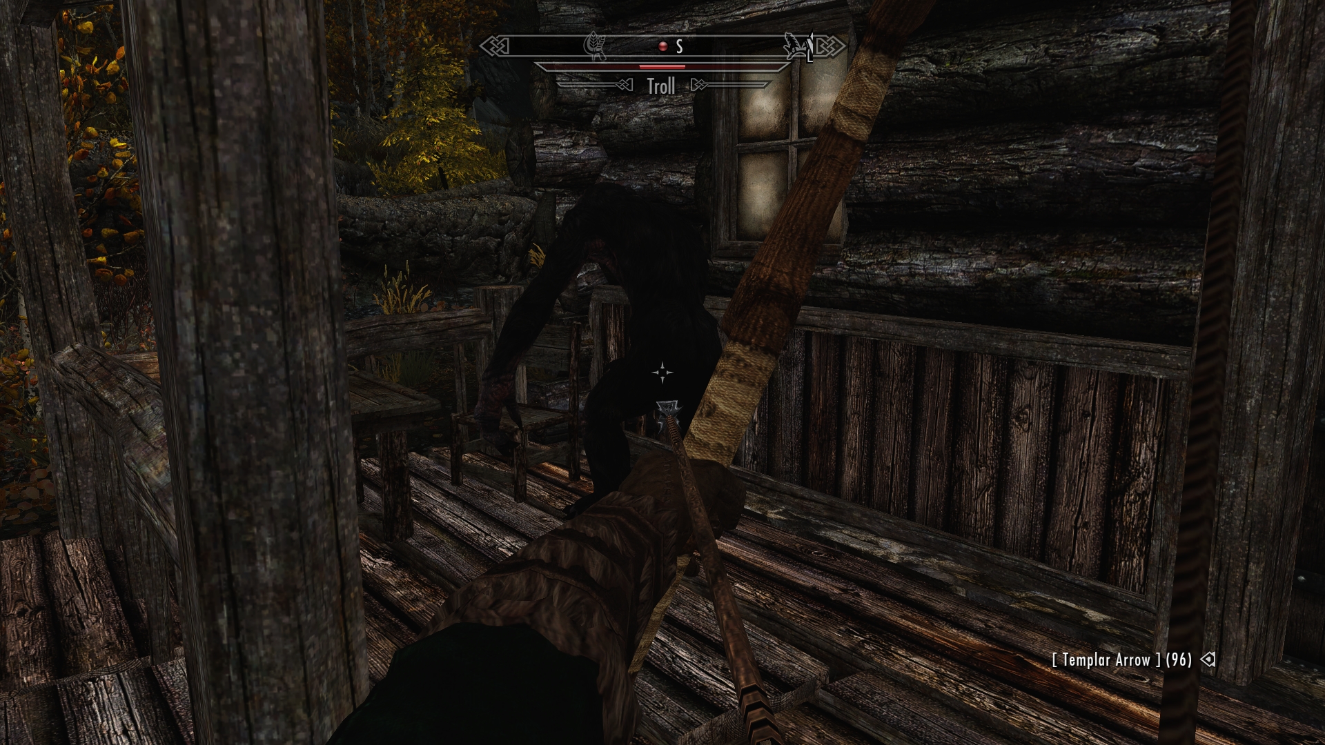 The troll corners Jenassa on the porch and cuffs her over the head, knocking her down.  Bastard!  I start filling its hide full of arrows, but the troll is surprisingly tough.  At least it’s no longer focused on my girlfriend, but Jenassa is taking a distressingly long time to recover.  I need to buy her more time, and fast.