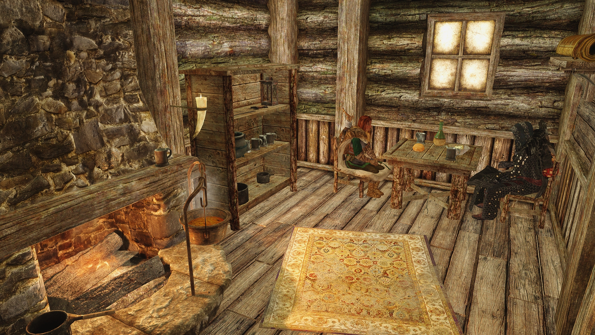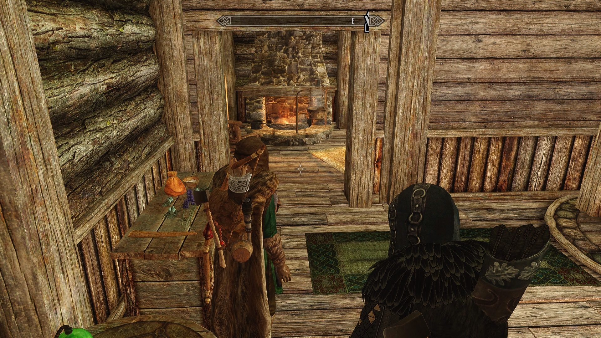 With the savage wildlife defeated for now, we unlock the cabin and open the door.  Inside it’s warm and pleasant, with a bright fire crackling cheerfully in the fireplace.  There’s also plenty of supplies in various containers, including some food, and there’s even an alchemy table.  It’s not the most opulent place we’ve ever seen, but it’s easily on par with some of the better inns.