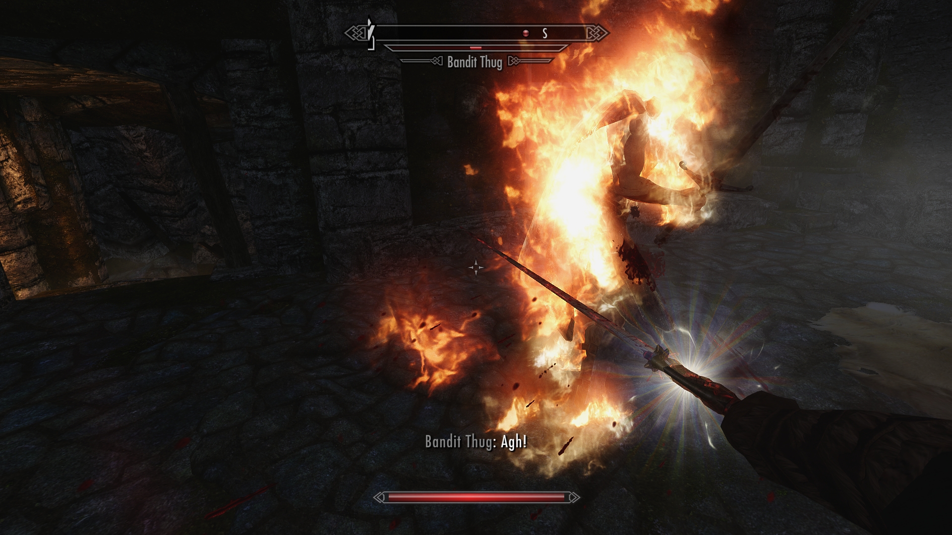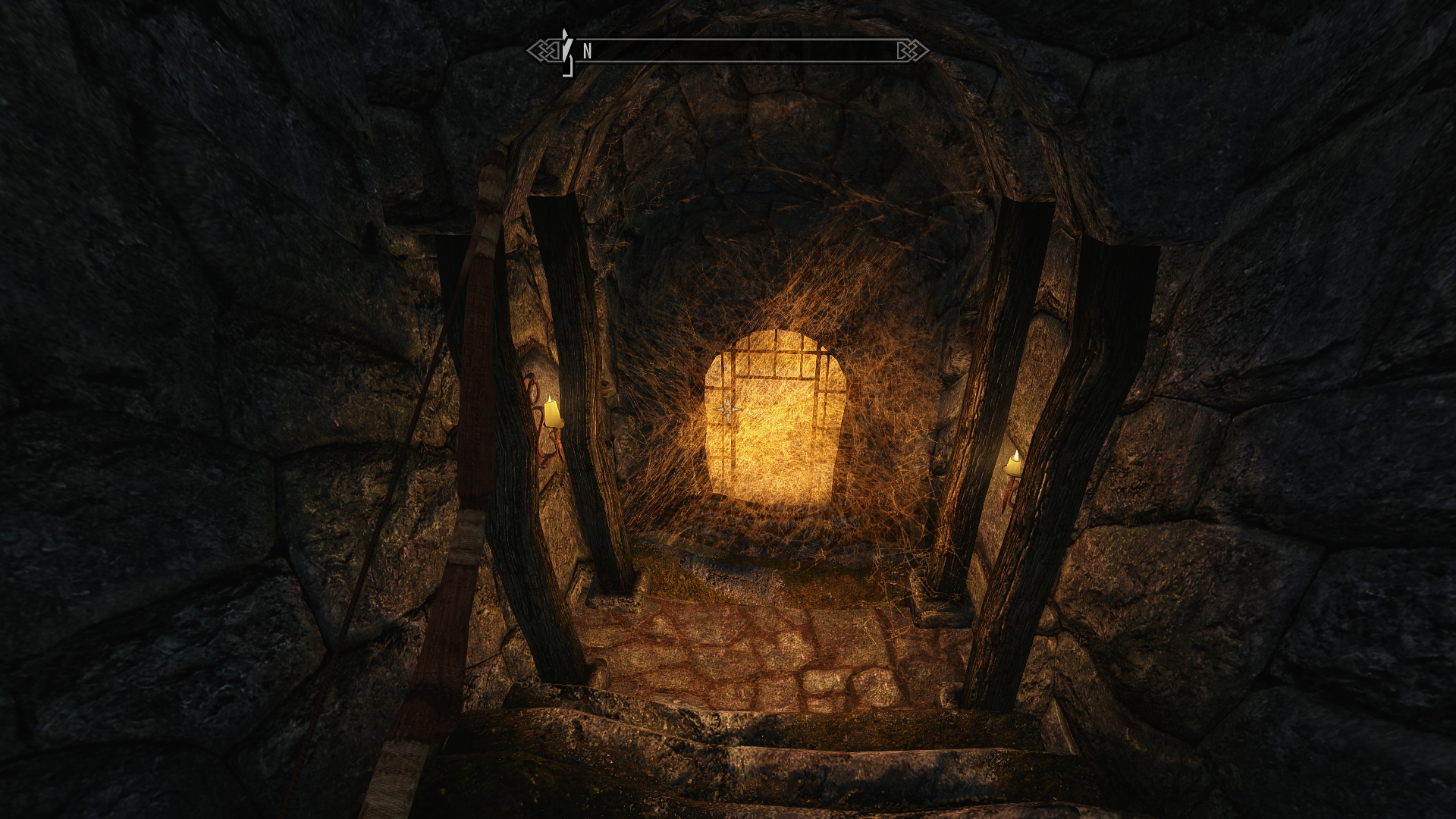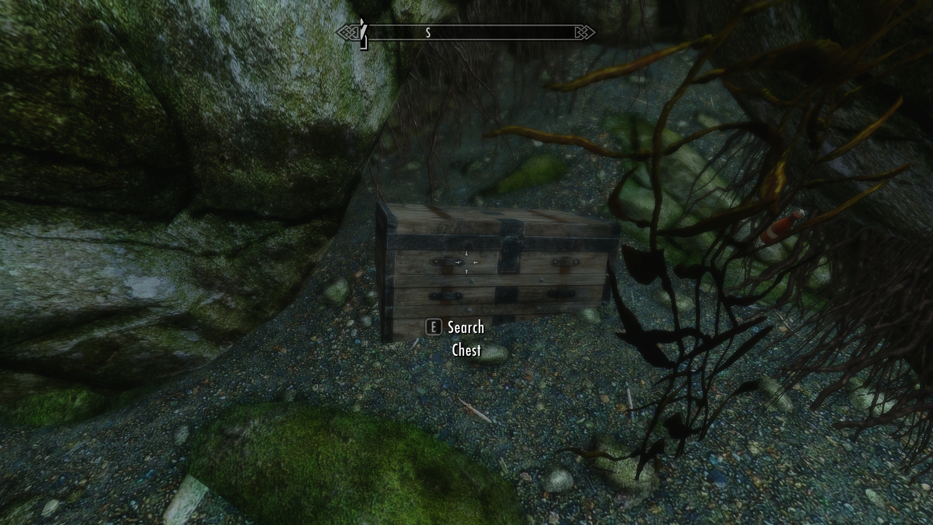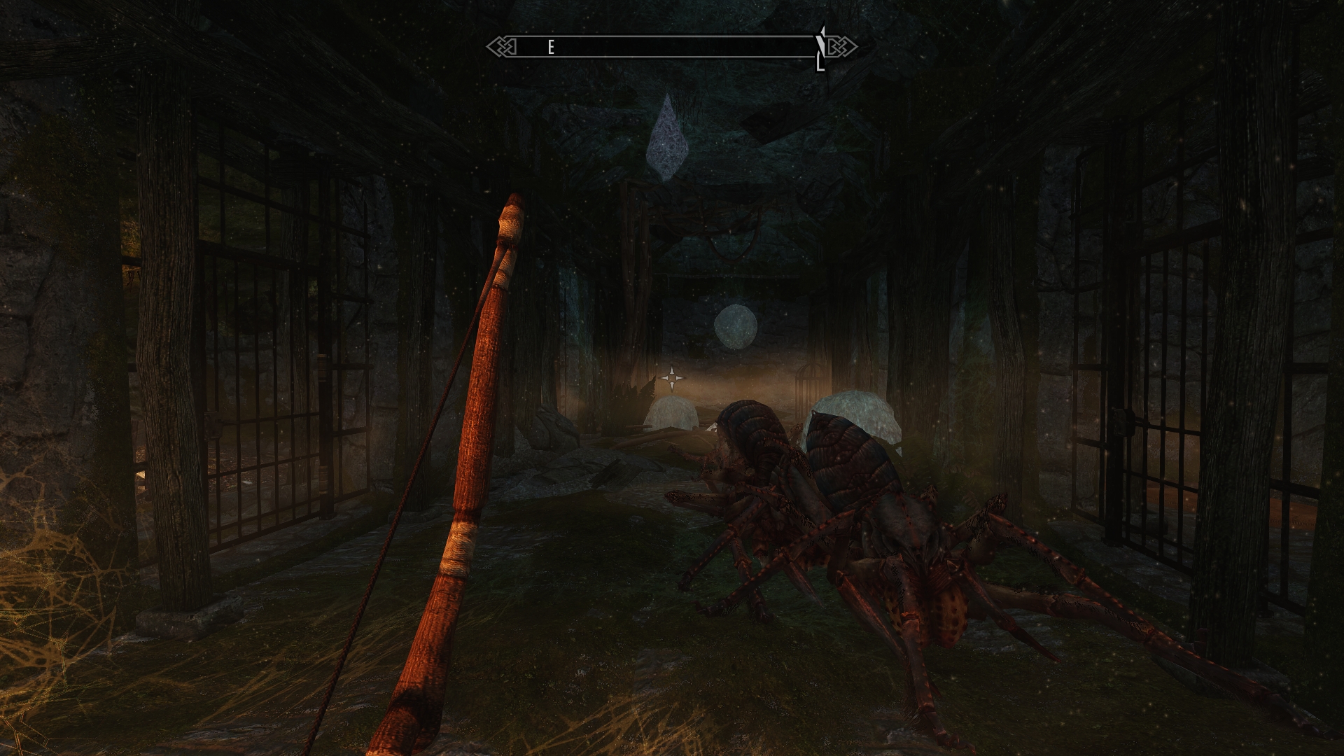 Outside it’s cold and rainy, and night has already fallen.  I’m not feeling too confident about our ability to make it back to the cabin in the dark, since that’s well on the other side of Shor’s Stone from here.  We start looking for a place to set up camp — ideally someplace that’s not the interior of a death cat lair.