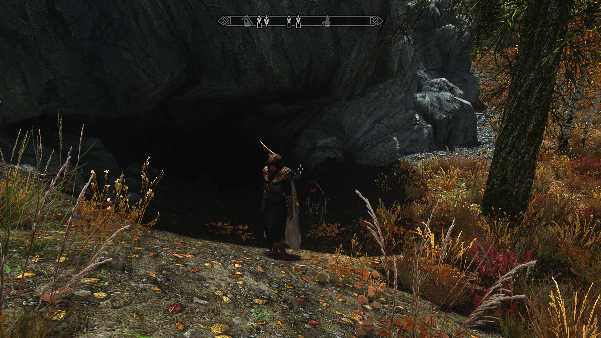 After we dispose of the wolves, Jenassa and I decide to explore the other side of the woodlands around Shor’s Stone.  We head toward the eastern mountains, and eventually we come upon the entrance to a cave in the hillside.  We discover a wooden cart parked outside the cave, which seems rather unusual.  Thinking there might be bandits inside, we opt to investigate.