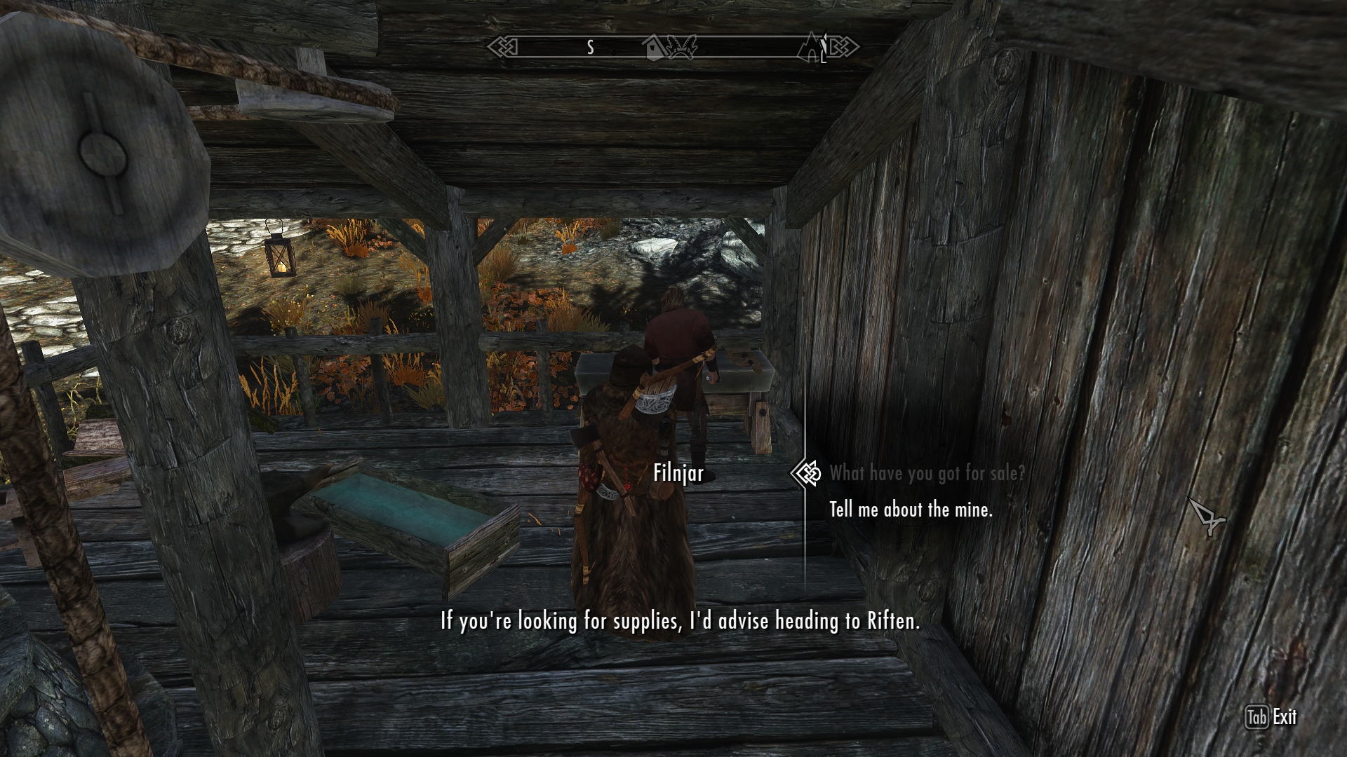 It’s no surprise that we’re in this situation, given that the last time we saw a general store was back in Whiterun.  Jenassa and I are just starting to discuss the problem when the blacksmith puts in his two cents.