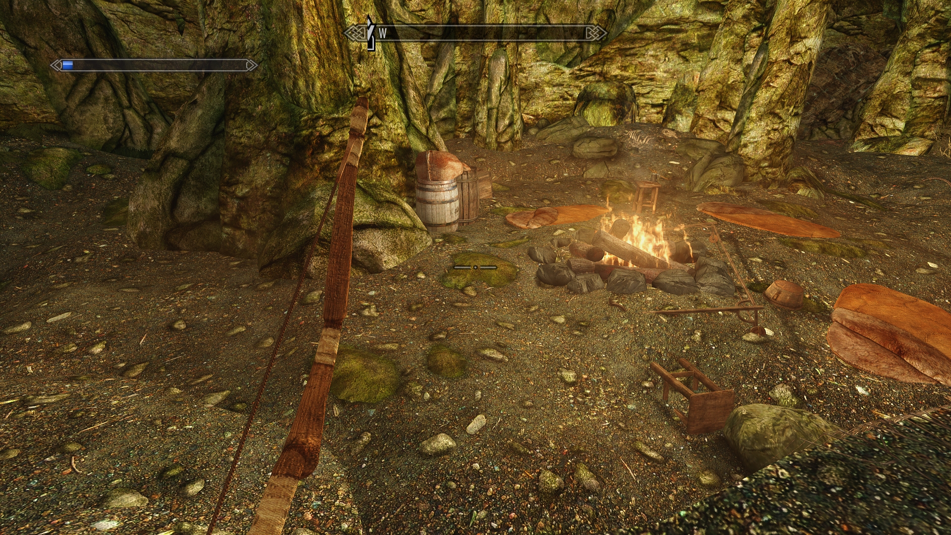 We drop to a crouch and head inside the cave.  After our eyes adjust to the dim interior, we notice that there’s a flickering light up ahead.  We follow it to an area that was recently used as a campsite, complete with bedrolls and scattered supplies, with a fire still burning.