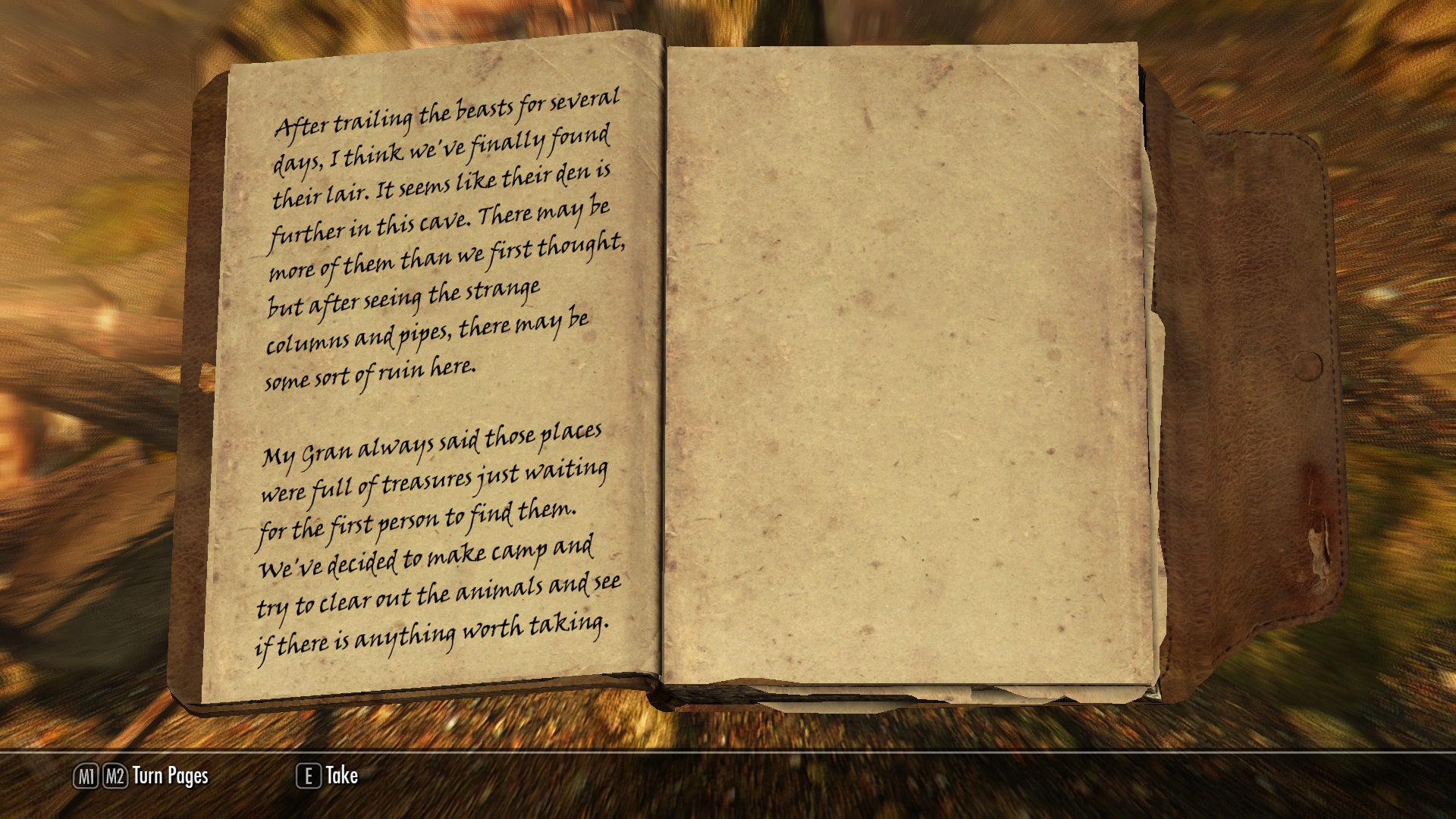 Jenassa and I start looking around the abandoned site, searching for anything useful.  Near the campfire are two stools, one of which is overturned and lying on the ground.  On the stool that’s still upright is a journal.  I pick it up and start reading.