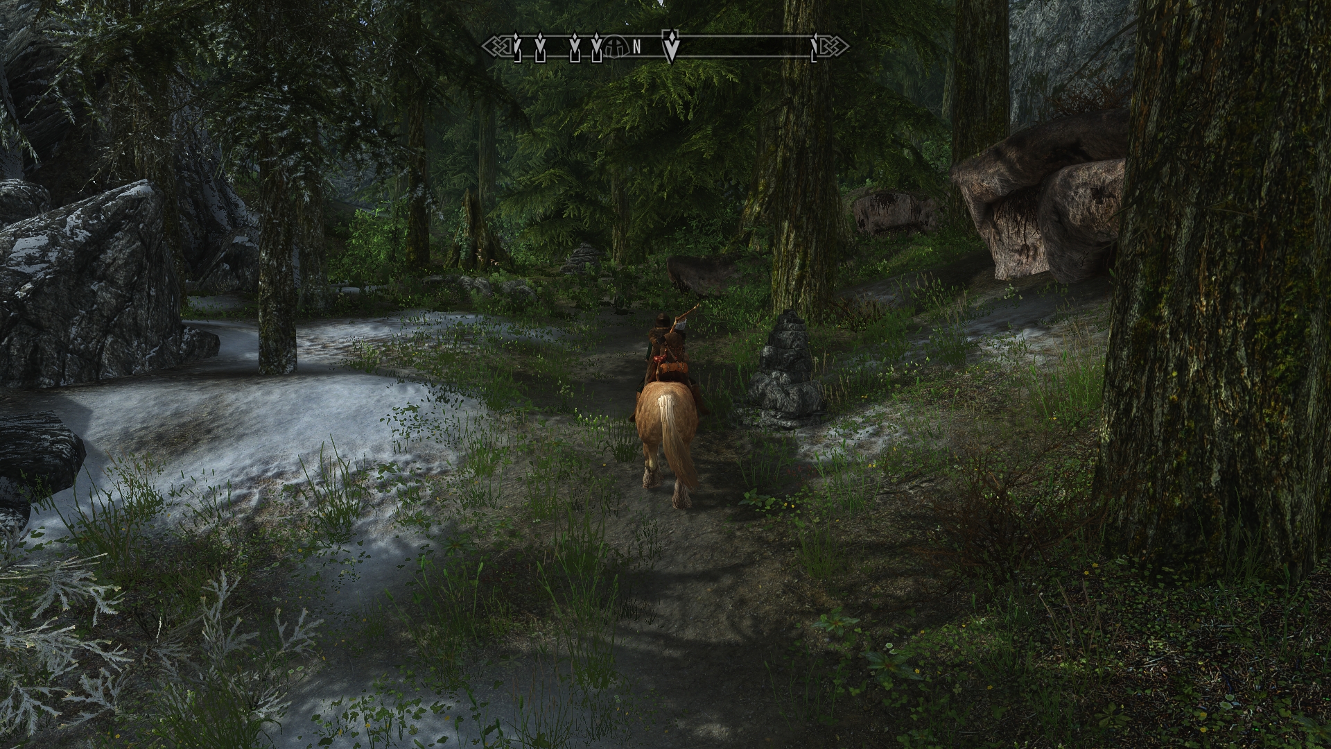By now it’s getting pretty dark, not to mention cold, but it’s still not very late. We decide to continue on our way to the town of Falkreath — especially since neither of us relishes the thought of camping near a hagraven nest. So after we locate our horses again, we’re right back on the road.
