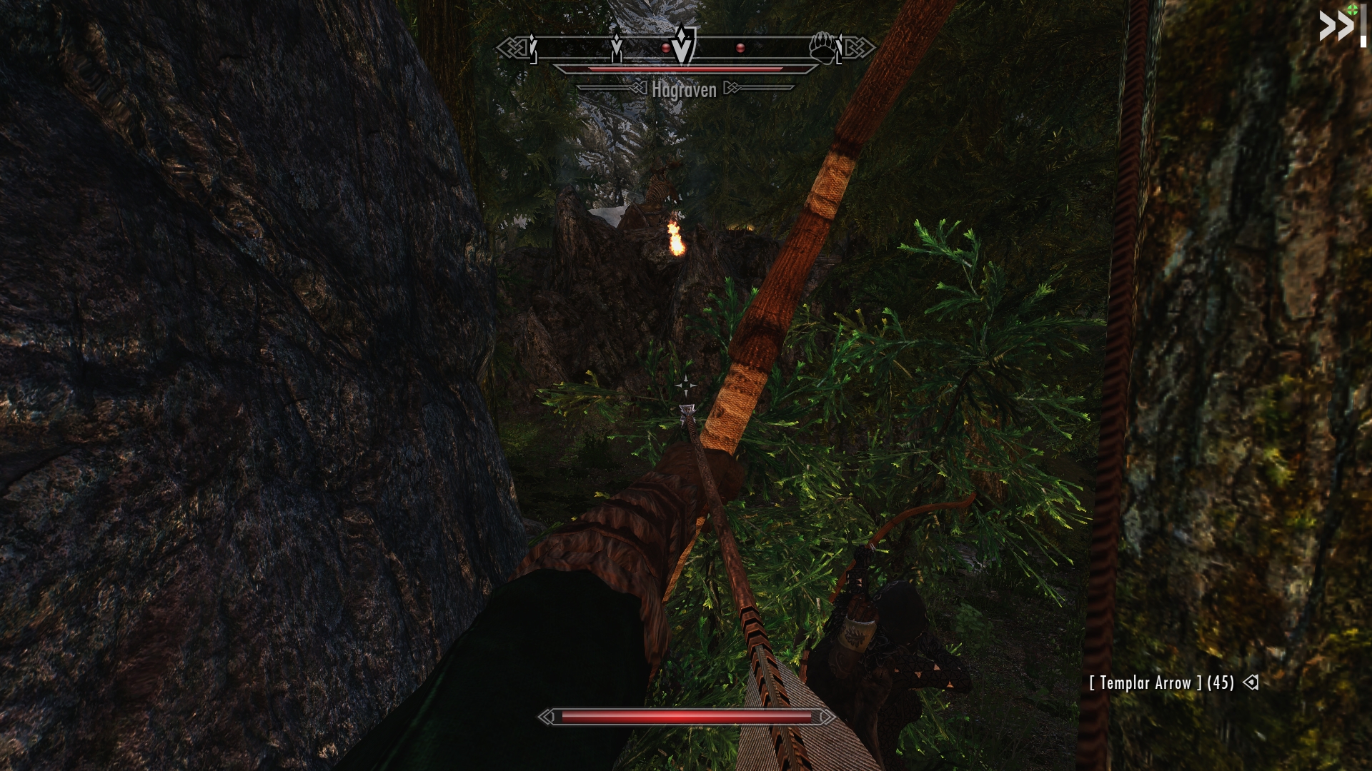 I reach the outcropping before Jenassa does and start rummaging in my backpack for some mead. It’s getting really cold out here. I crouch behind the rocks to start a hidden campfire, but unfortunately they’ve spotted my wife. Fireballs rain down from the top of a massive boulder, giving away Jenassa’s position, and several robed figures move toward her through the trees. I pull out my bow and start shooting at the source of the fireballs, but it’s difficult to fire accurately in the darkening woods.