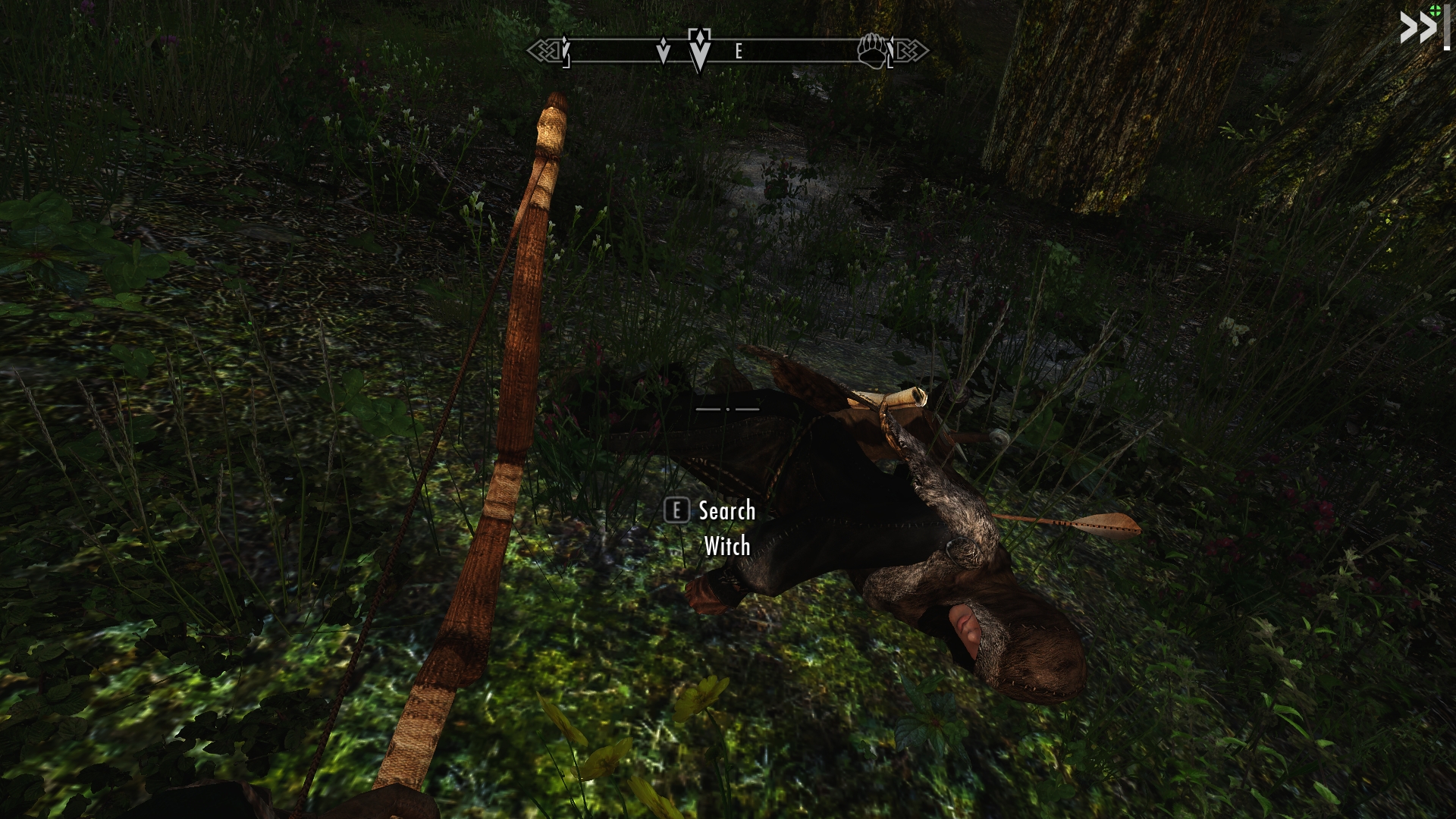 “Danica in Whiterun,” she replies thoughtfully, gazing into the trees. “She mentioned there were hagravens around here, and they possess an artifact she needs to repair the tree. I believe we may have found their coven.” Before I can reply, she slides off her horse in silence and readies her bow.
