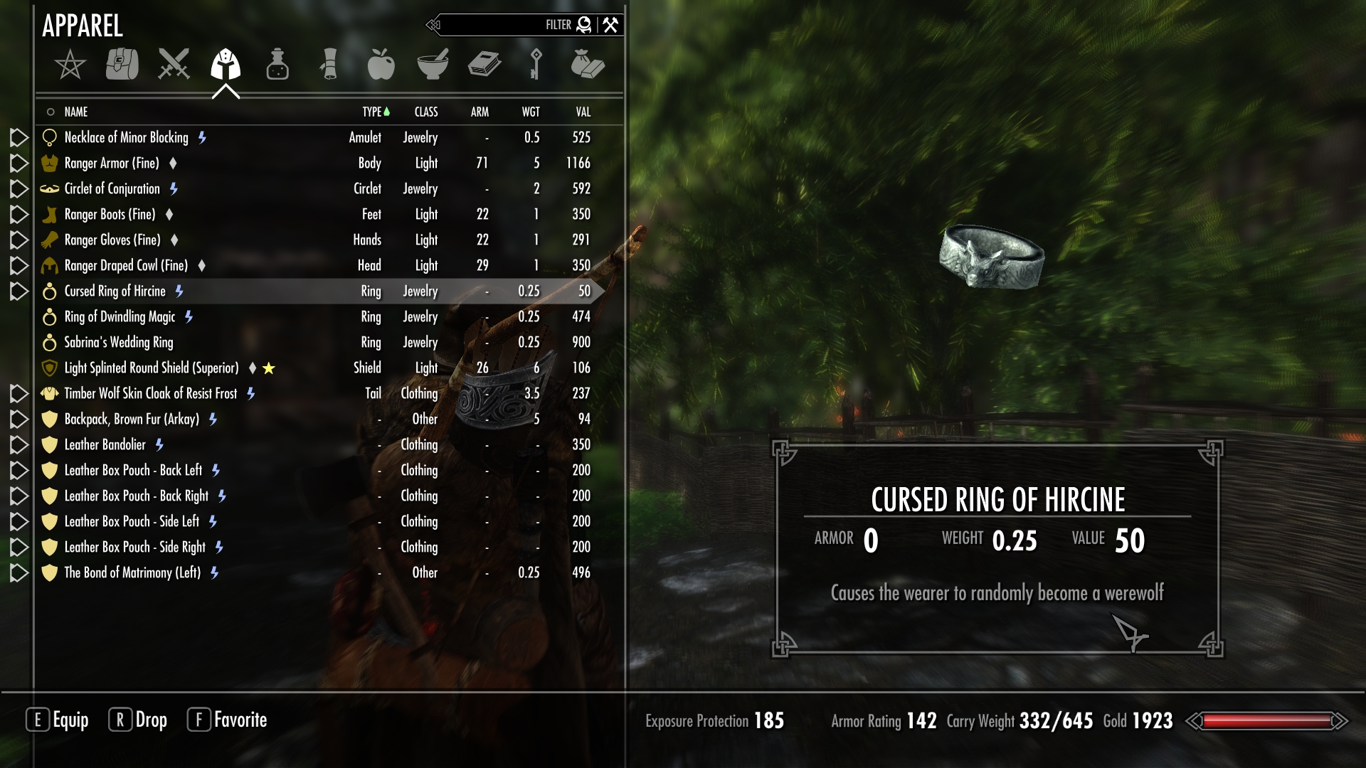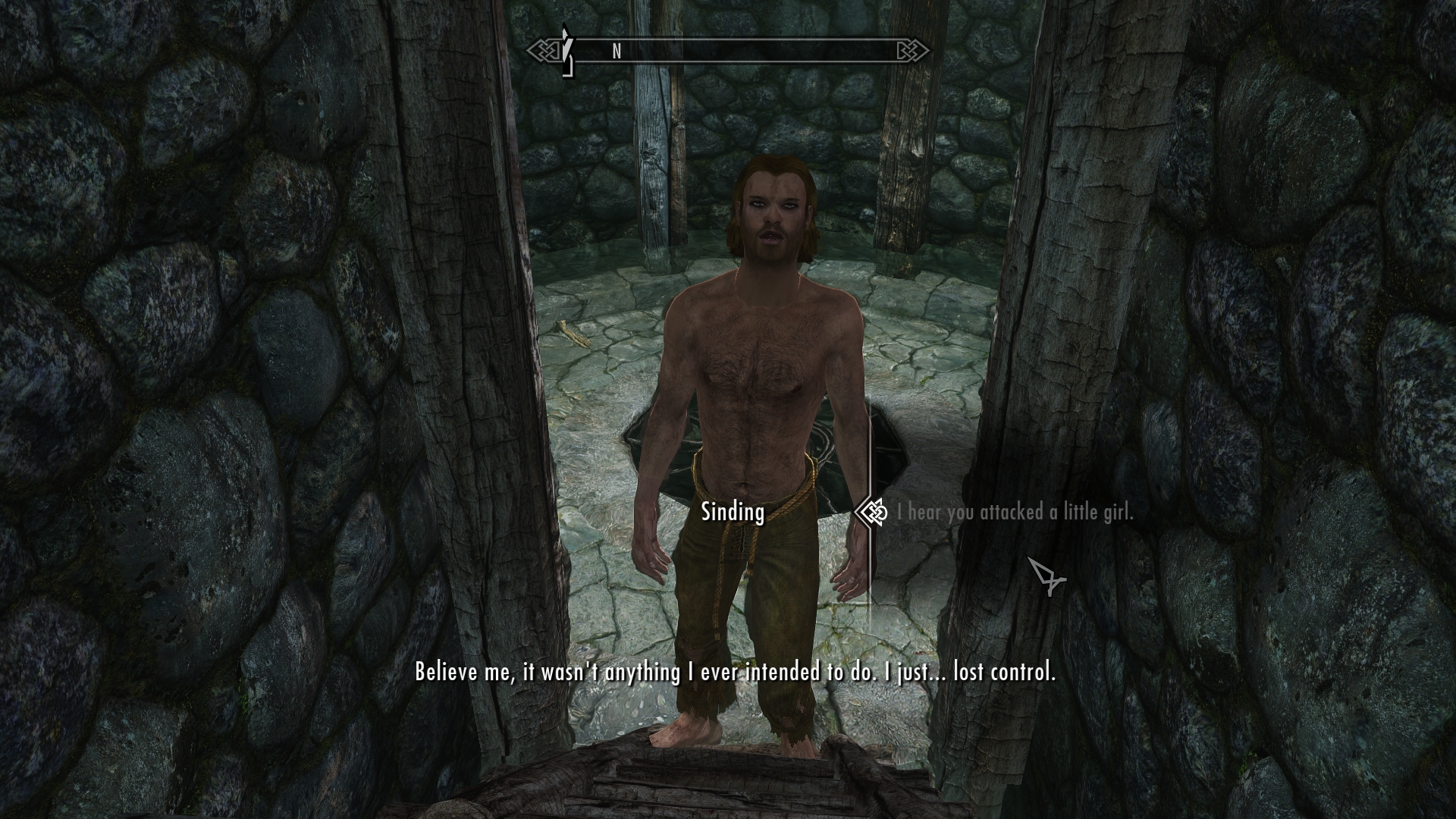 The prisoner’s name is Sinding, and his story is strange, to say the least.  After he admits to slaughtering the little girl, he confesses an even bigger secret — that he’s a werewolf, subject to becoming a beast when the moons are full.   He disliked being at the mercy of his transformations, since it made it hard to live in civilized society, and so he stole a powerful ring that was supposed to be able to give him control of when he would change. Unfortunately, the Daedric prince Hircine didn’t appreciate the theft — and cursed the ring instead.