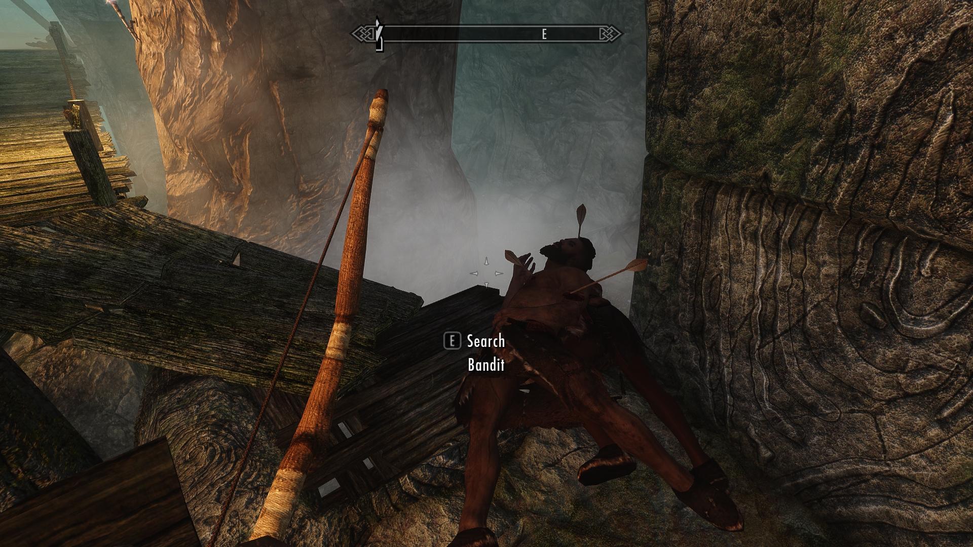 Glancing past a broken wood barrier, I can see a rickety wooden bridge leading to a platform at the far end. More bandits appear to be patrolling the area on the other side of the bridge. Hoping to take advantage of our concealed position, I nock an arrow to my bow and take aim.