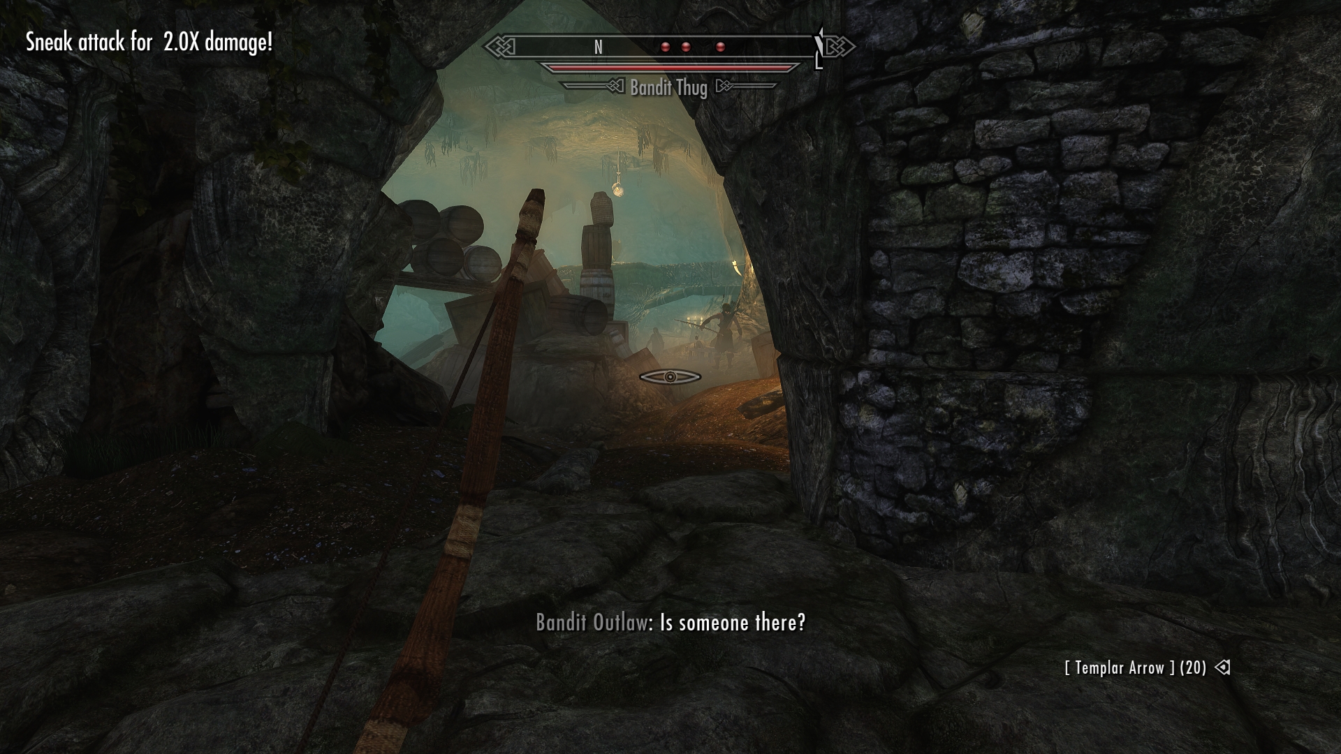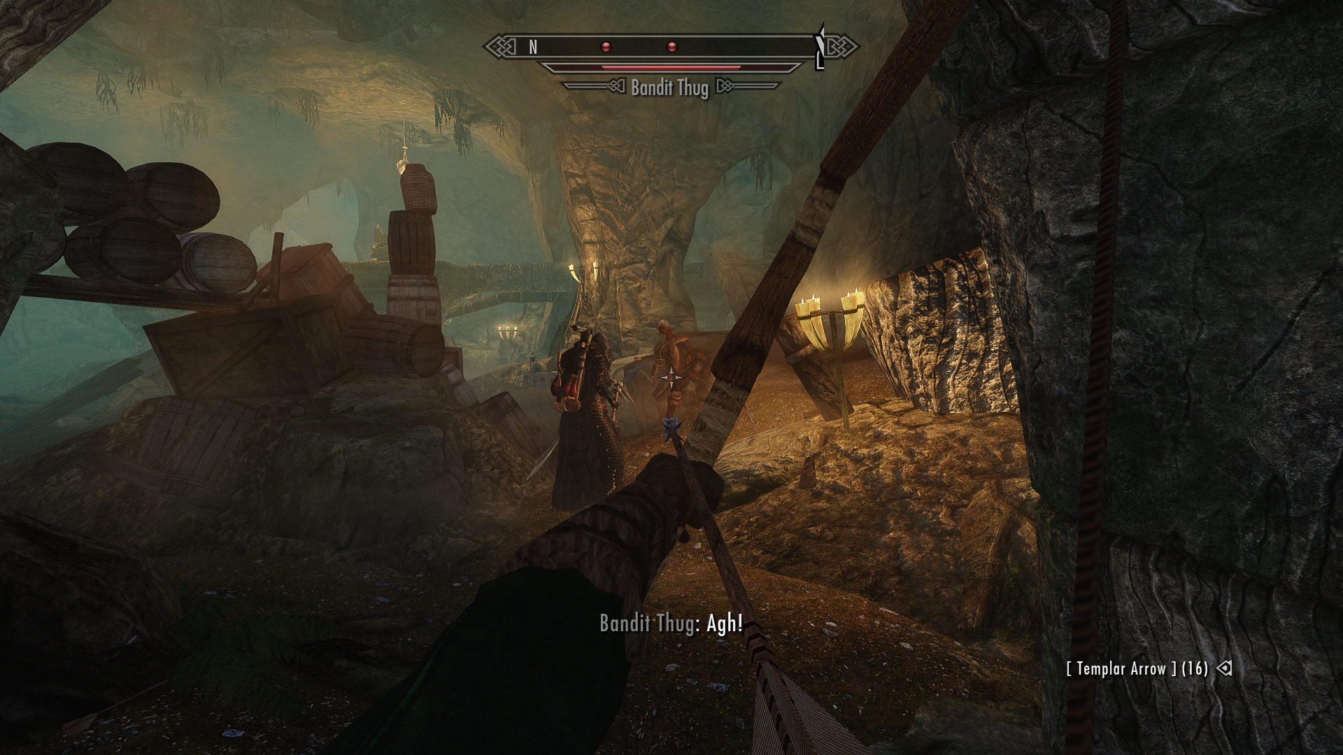 The next room is filled with various crates and barrels, and several bandits are talking among themselves. I inch my way forward to hear what they’re saying, but my foot accidentally kicks a pebble into the wall. The rattling noise echoes off the walls, and one of the bandits starts to turn. I swiftly fire a shot in her direction, striking her down before she has time to react.