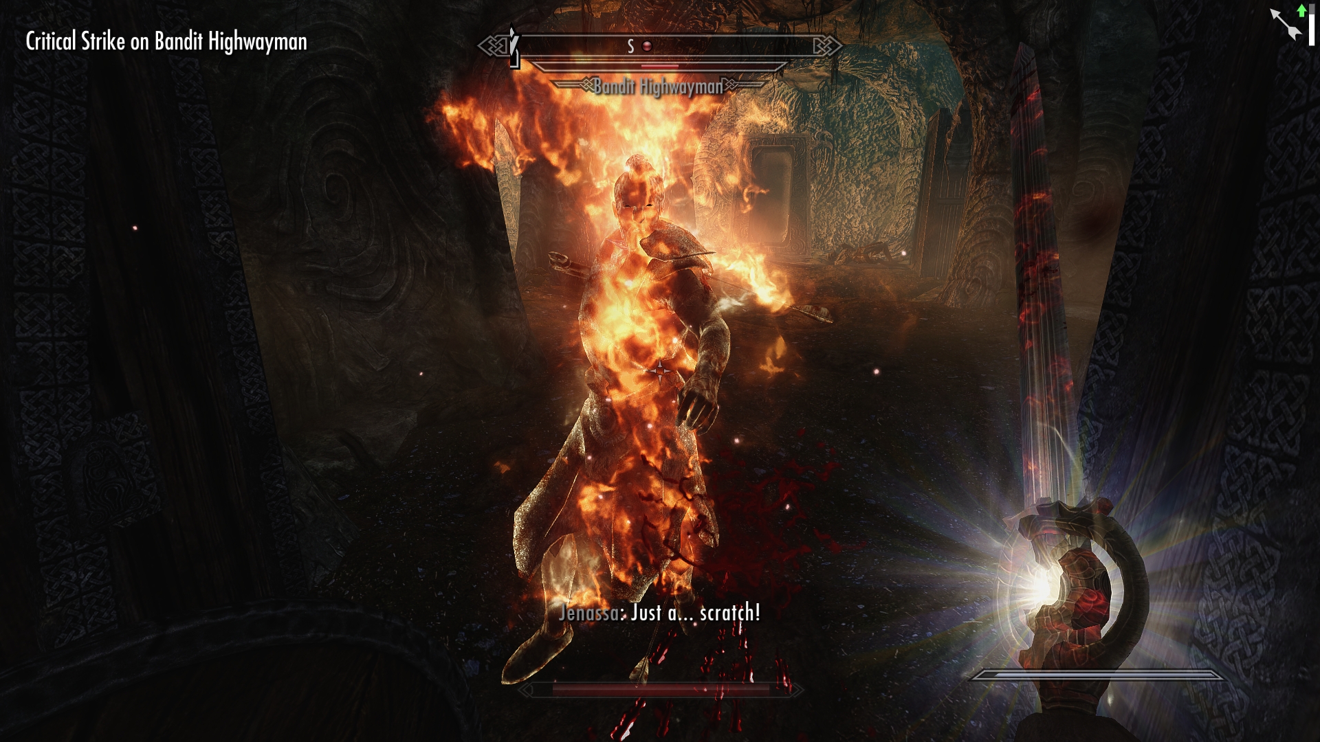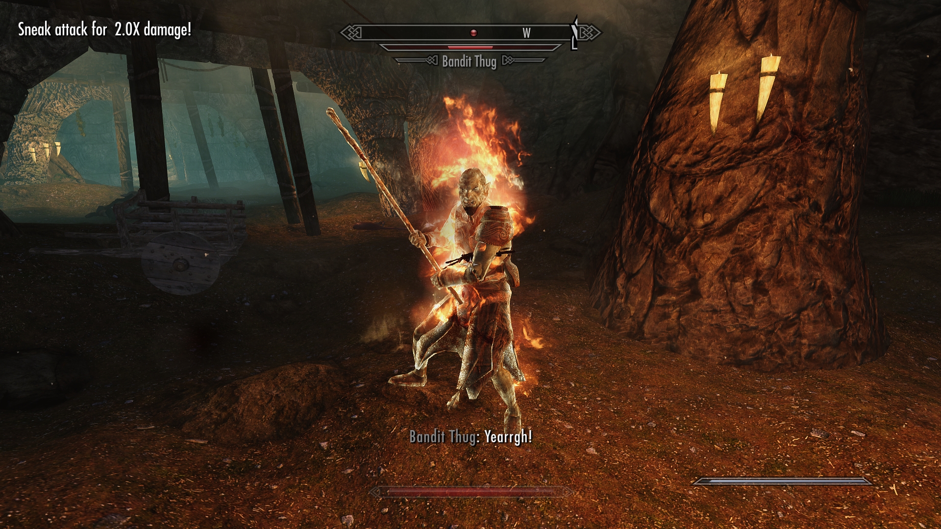 We continue through the caverns, looting chests and taking names. Every room seems to lead to more passages, and every passage to more rooms — all guarded by bandits. As my last few arrows dwindle, I pull out Dawnbreaker and start setting our enemies on fire instead — which is far more dangerous, but always very satisfying.