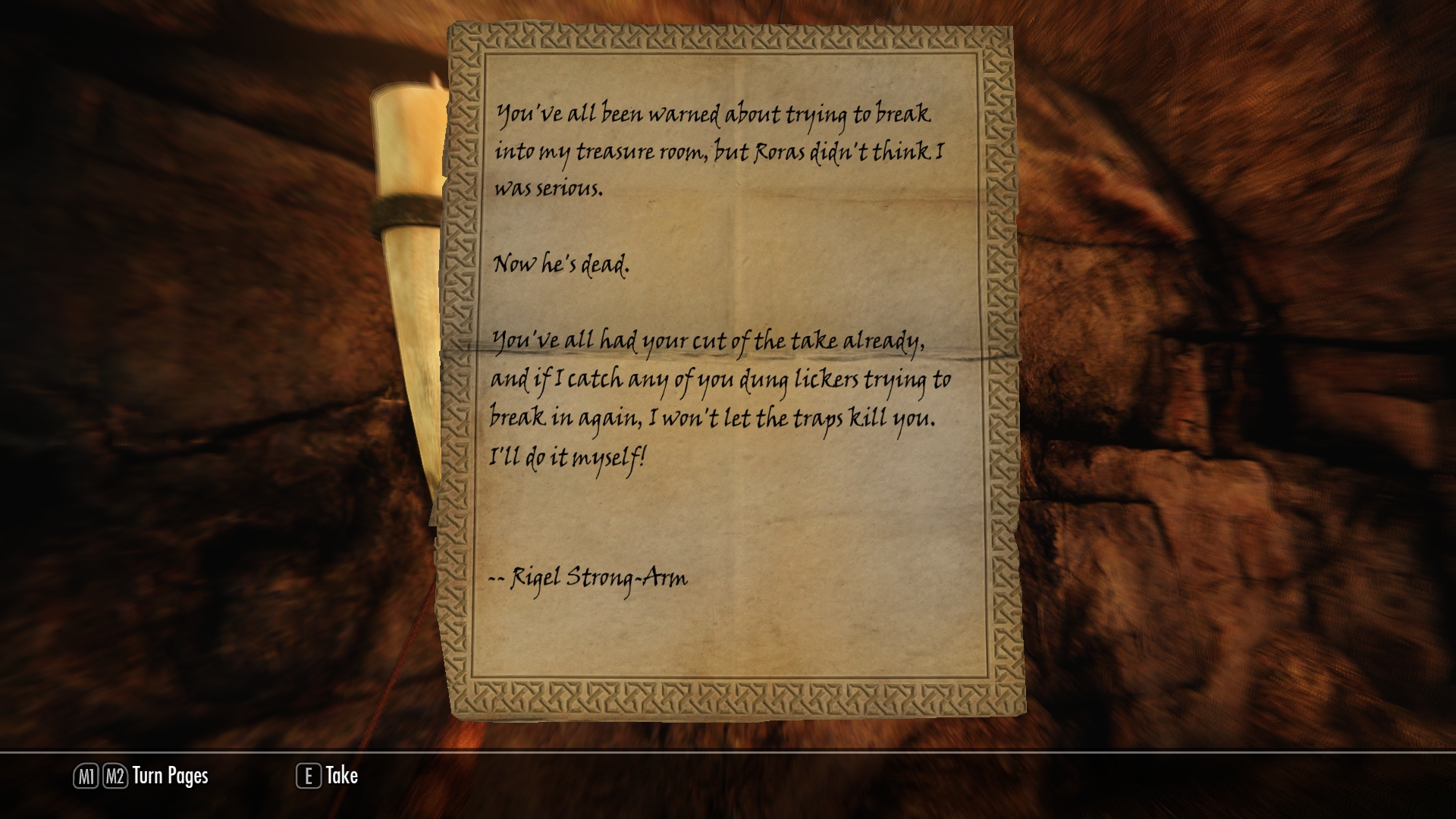 We’re about to head down a long winding passage when something catches my eye. Pinned to the wall is another note from the bandit leader. Seems she’s had to resort to more persuasive forms of discipline just to keep order in the ranks.