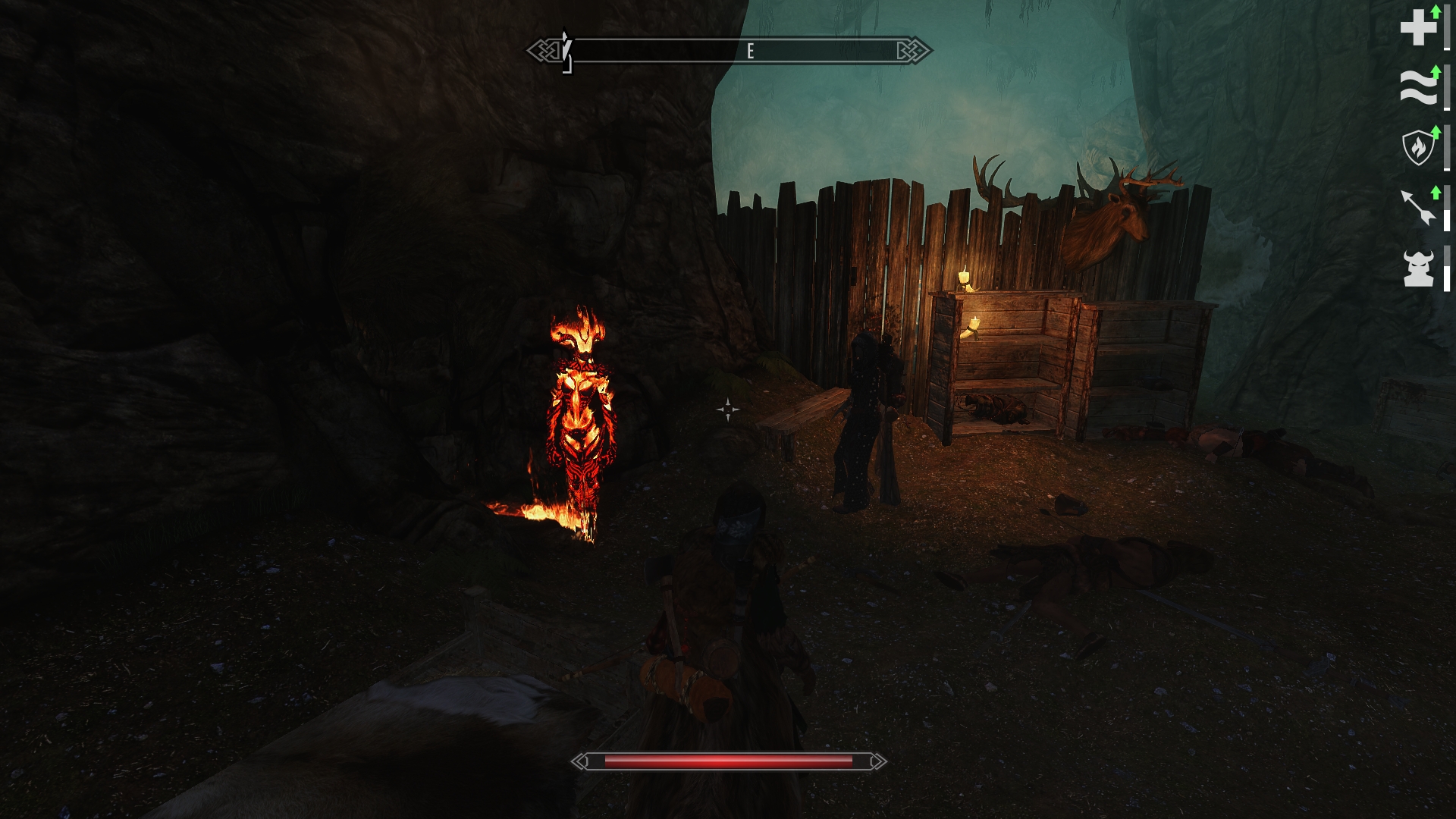 The blizzard rages throughout the night and into the next day. Jenassa and I awaken to a frozen world that’s nearly unchanged since last night. Our fire has gone out and the chill threatens to settle into our bones, so we strike camp and set off on our horses in an effort to find our way back to the town of Falkreath.