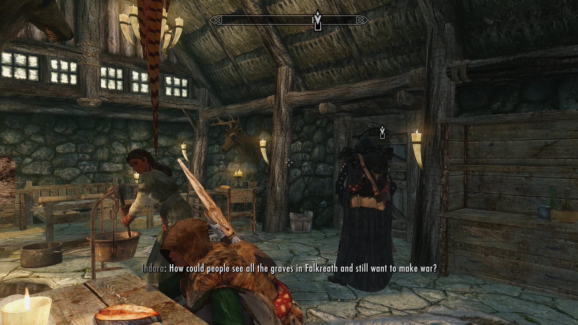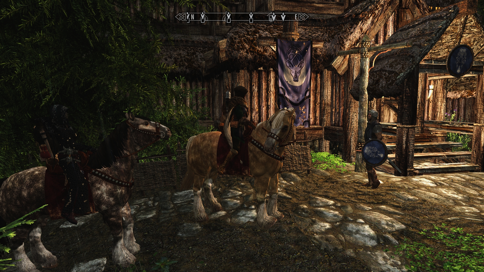 We guide our horses toward the middle of town, coming to a halt just outside the Jarl’s hall and out of the wind. Falkreath doesn’t seem to have stables anywhere in town, or any other place that would be an appropriate shelter, but fortunately the horses of Skyrim are a hardy lot.