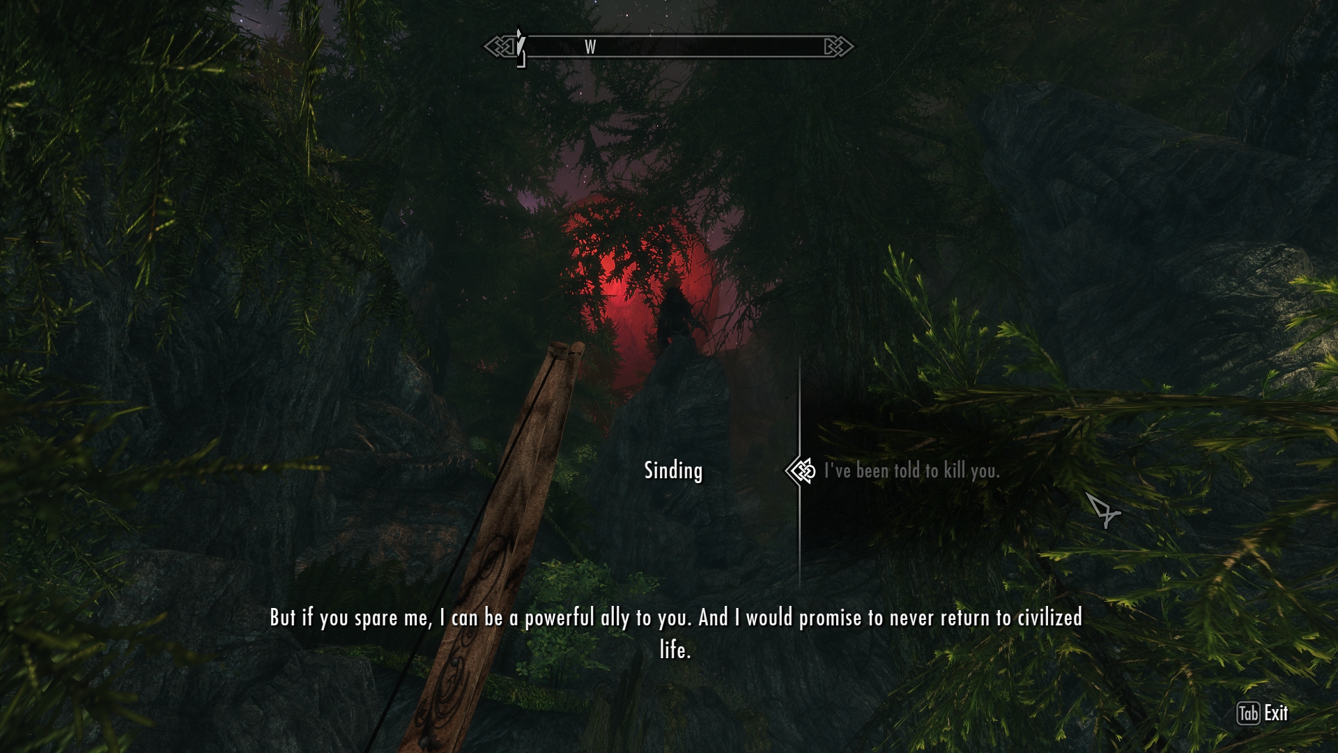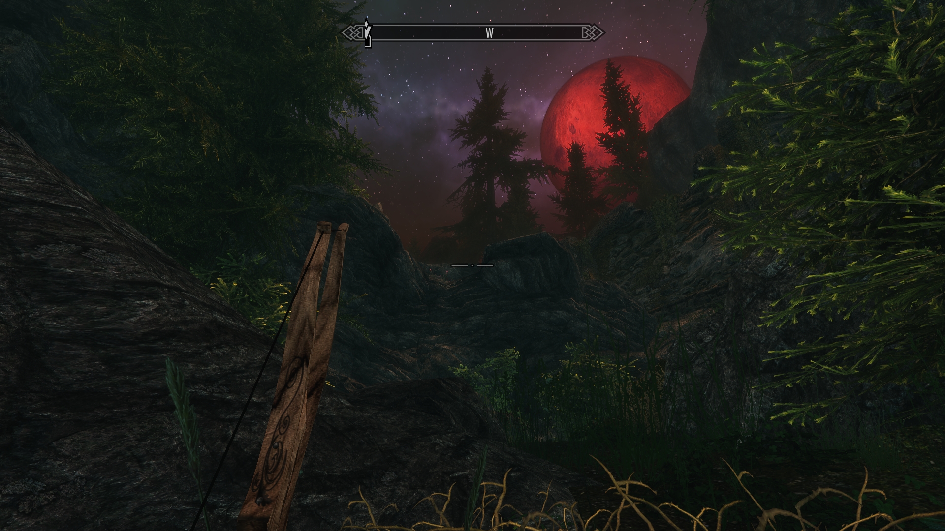 Suddenly a dark shape rises in front of us, high on a cliff and silhouetted against the moon. I raise my bow, but the figure speaks, and I recognize Sinding’s voice. He expresses surprise that I’ve found my way to the hidden grove, and asks me what I intend to do here. Somewhat relieved that we’re able to communicate, I tell him that I’ve been sent by Hircine. This gives Sinding pause, as he realizes what this must mean.
