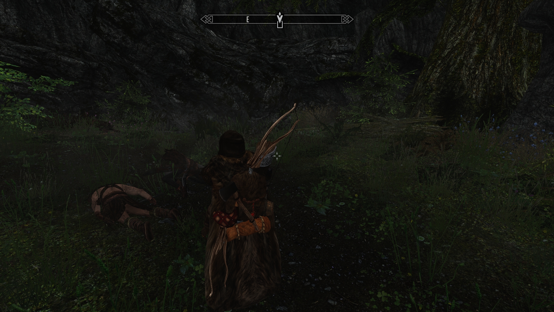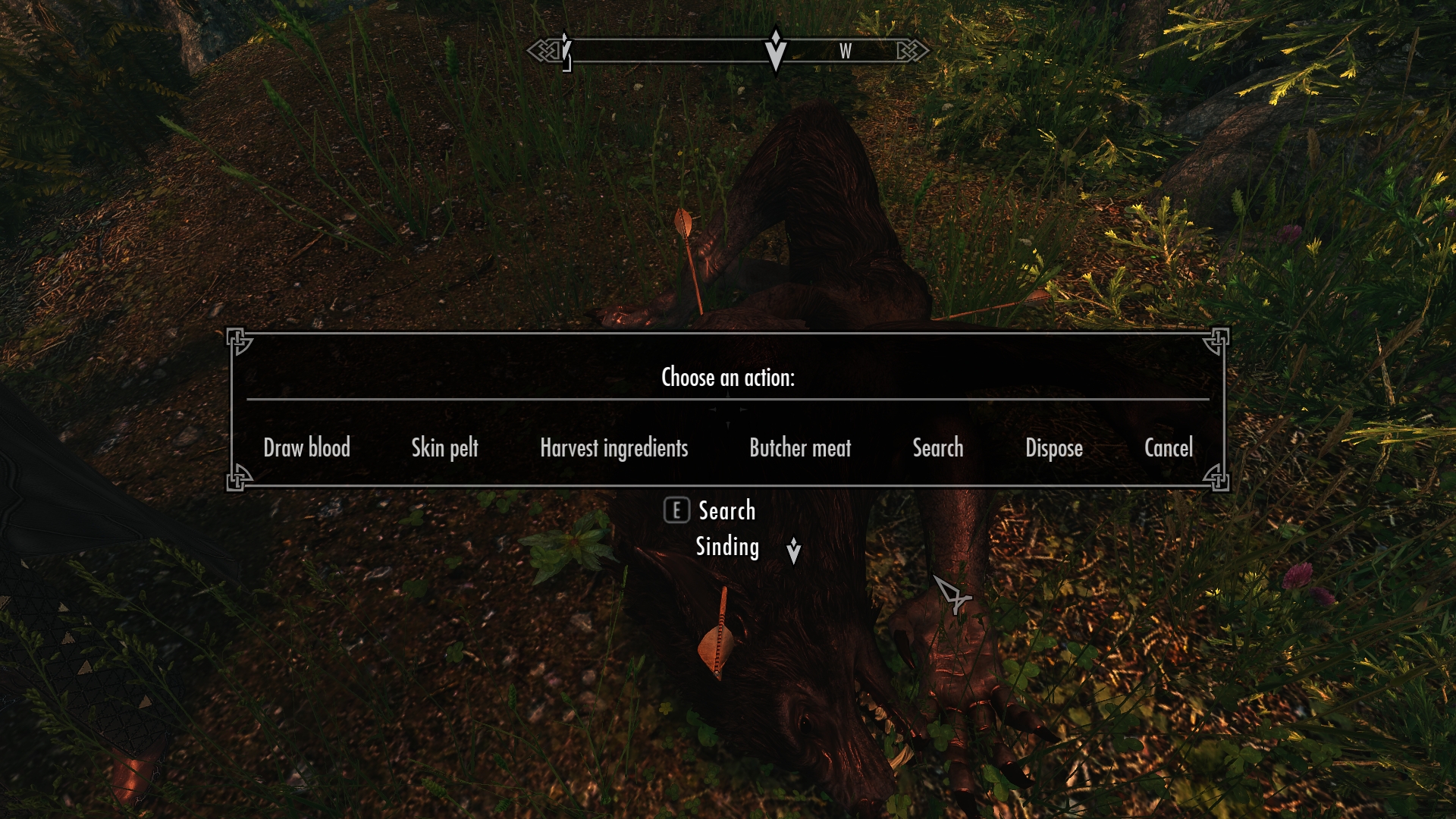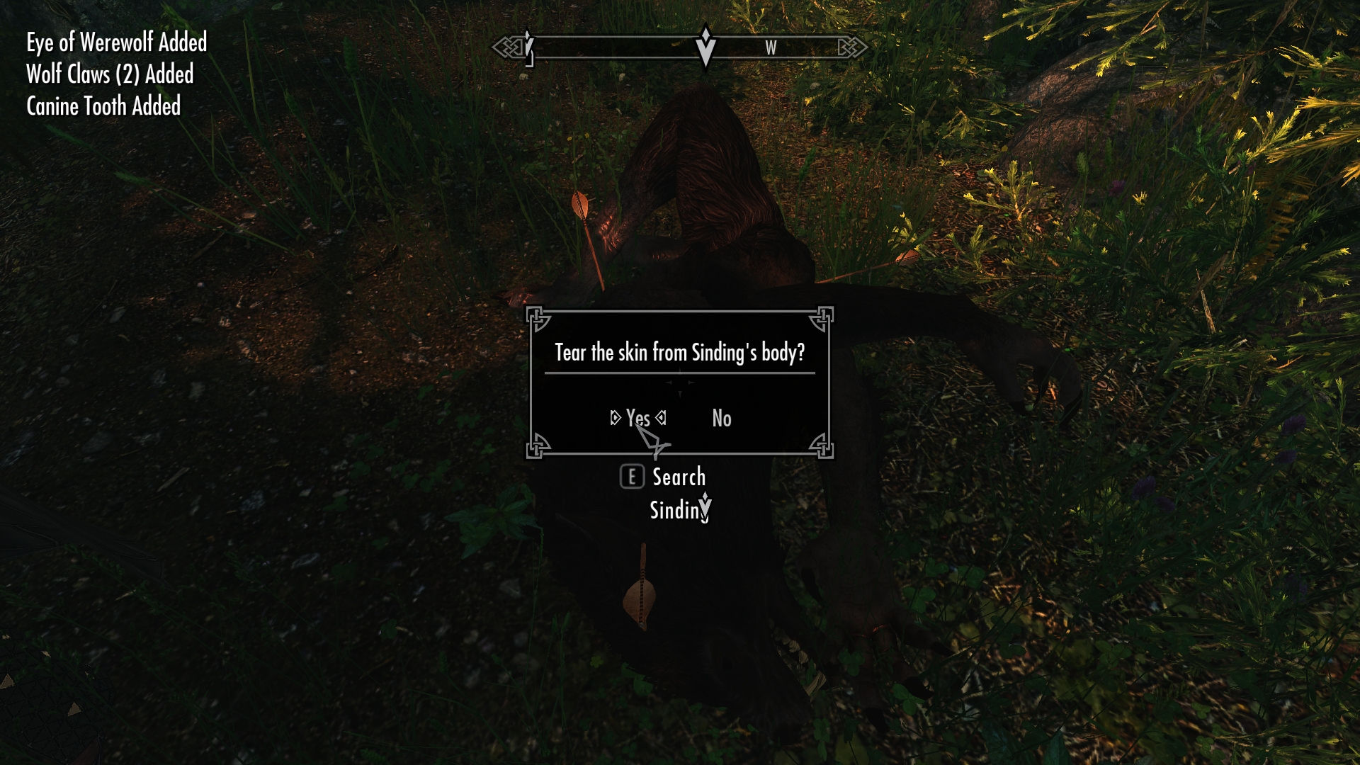 Seconds later, Sinding hits the ground, dead. Jenassa sheathes her blades as I approach, my hunting knife already in my hand. Hircine has charged me with the task of skinning the werewolf, but there are a few other souvenirs I plan to take first.