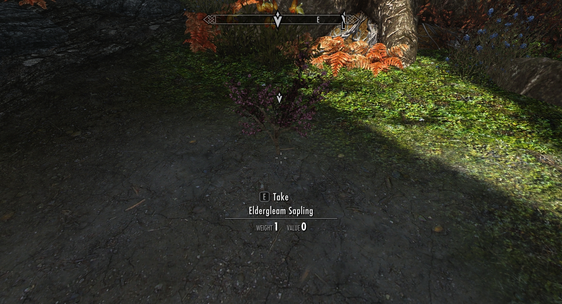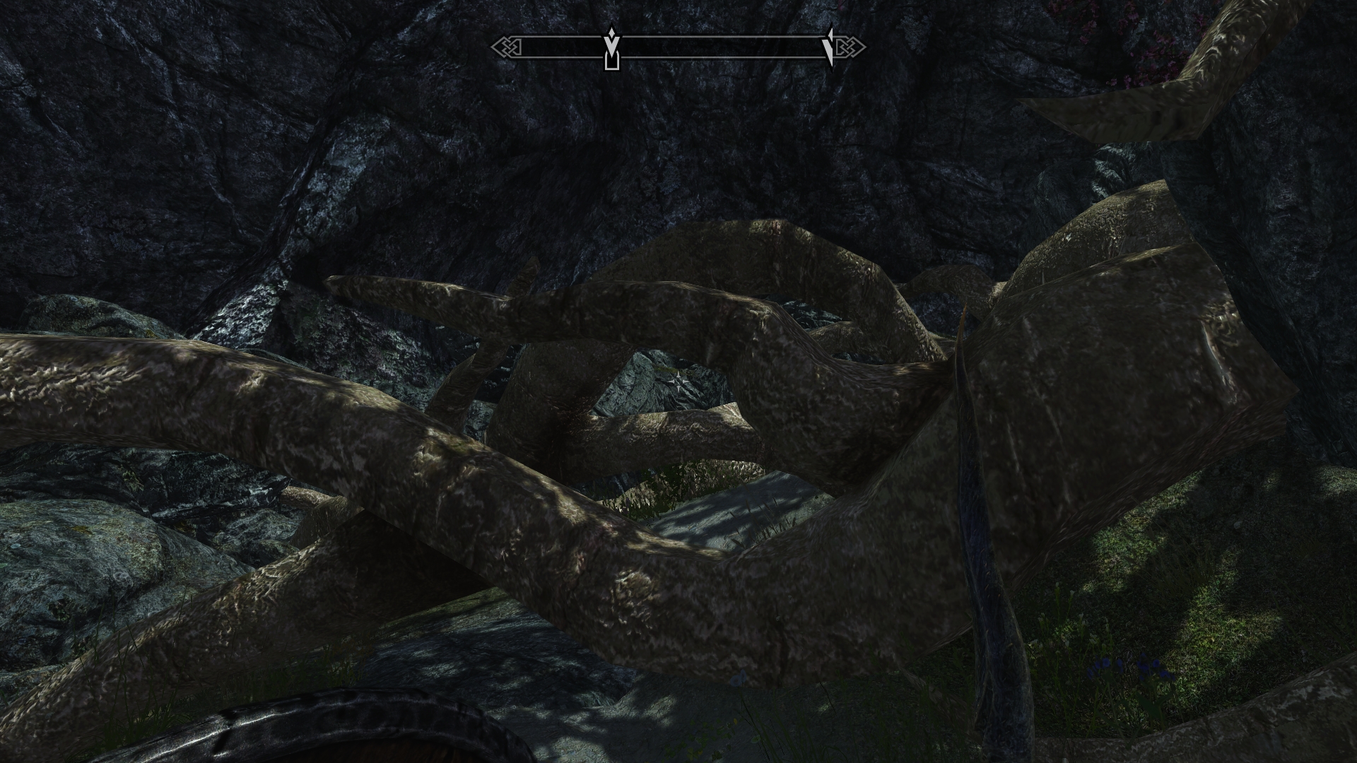 In this way Jenassa and I proceed up the path, poking at the roots with Nettlebane whenever they block our way, and watching with no small measure of astonishment as the Eldergleam snatches them off the trail at the dagger’s lightest touch. Blessed tree of Kynareth or not, this is one of the strangest examples of Skyrim’s vegetation that I’ve ever seen.