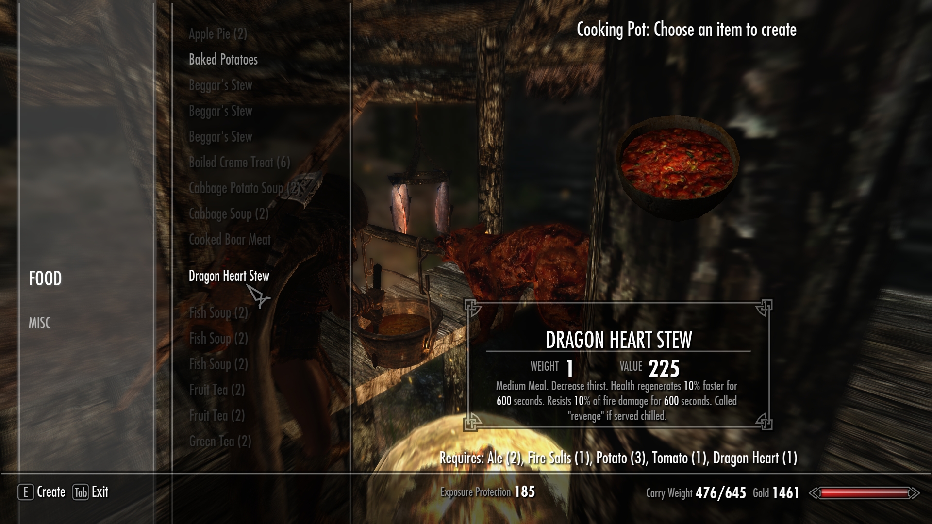 Using some of the ingredients found in the barrels, I start experimenting with the edible parts of the last dragon we encountered. My cooking skill must be improving, as I manage to create a hot and hearty meal for both of us.