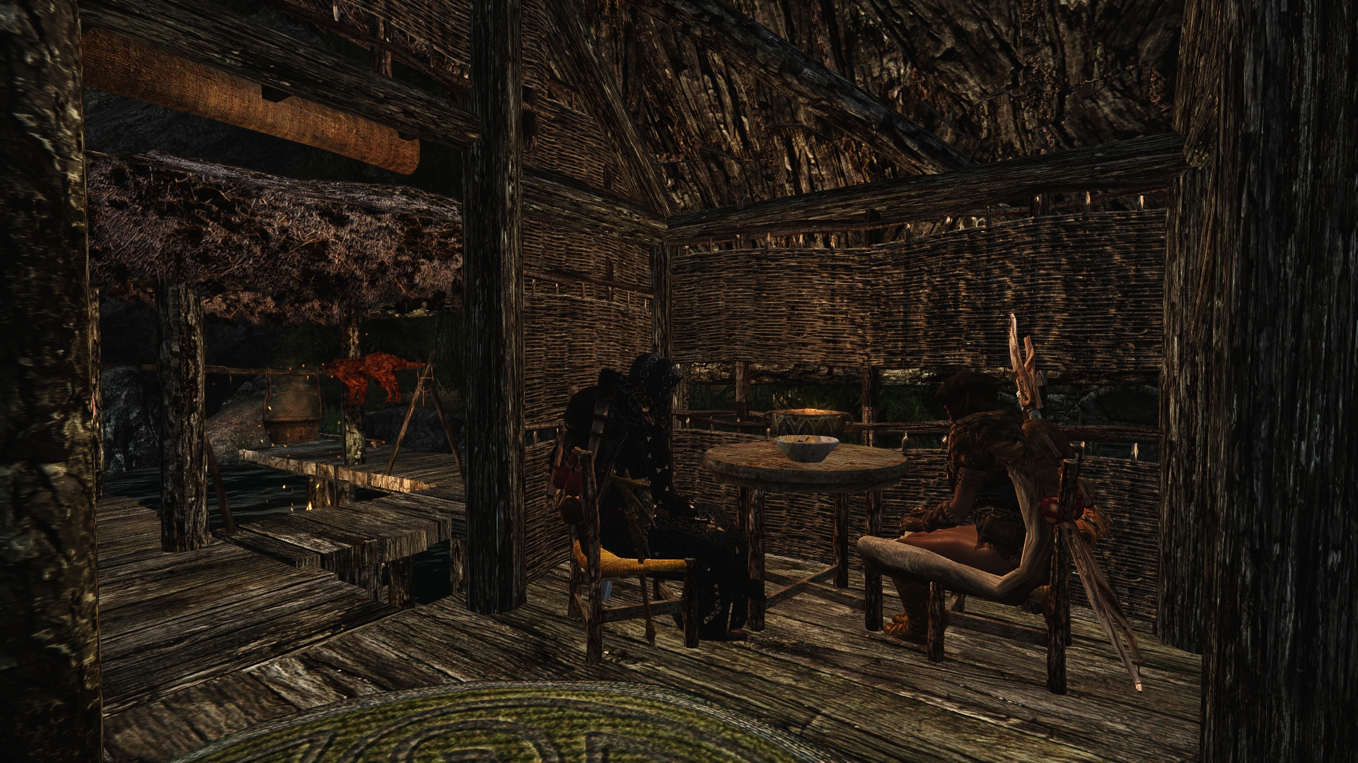 Leaving the horses to graze by the river, we climb a set of stairs toward the back of the dwelling and investigate the place. There’s a small enclosed room with a table and chairs, a wide cot, and a few shelves and containers for storage. Beneath this room is a covered patio with an alchemy table and a tanning rack, plus some barrels containing food, salt, and various alchemy reagents.
