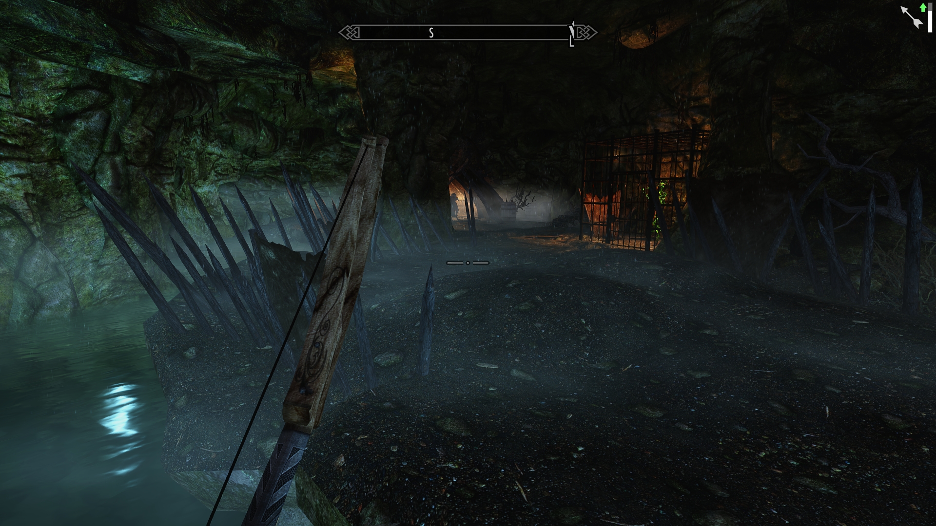 Since there’s no point in leaving perfectly good venison to go to waste, we head down to salvage what we can from the remains. Fortunately the pool of water is shallow, barely up to my knees at the deepest point, so it’s no problem to butcher the carcass. As I’m finishing up, Jenassa directs my attention to the tunnel leading away from the pool, and suggests that we might be able to exit the cave that way. I’m not eager to haul a heavy load of moose meat back up that steep ramp, so I agree to her proposal. With our bows at the ready, we make our way into the darkened tunnel.