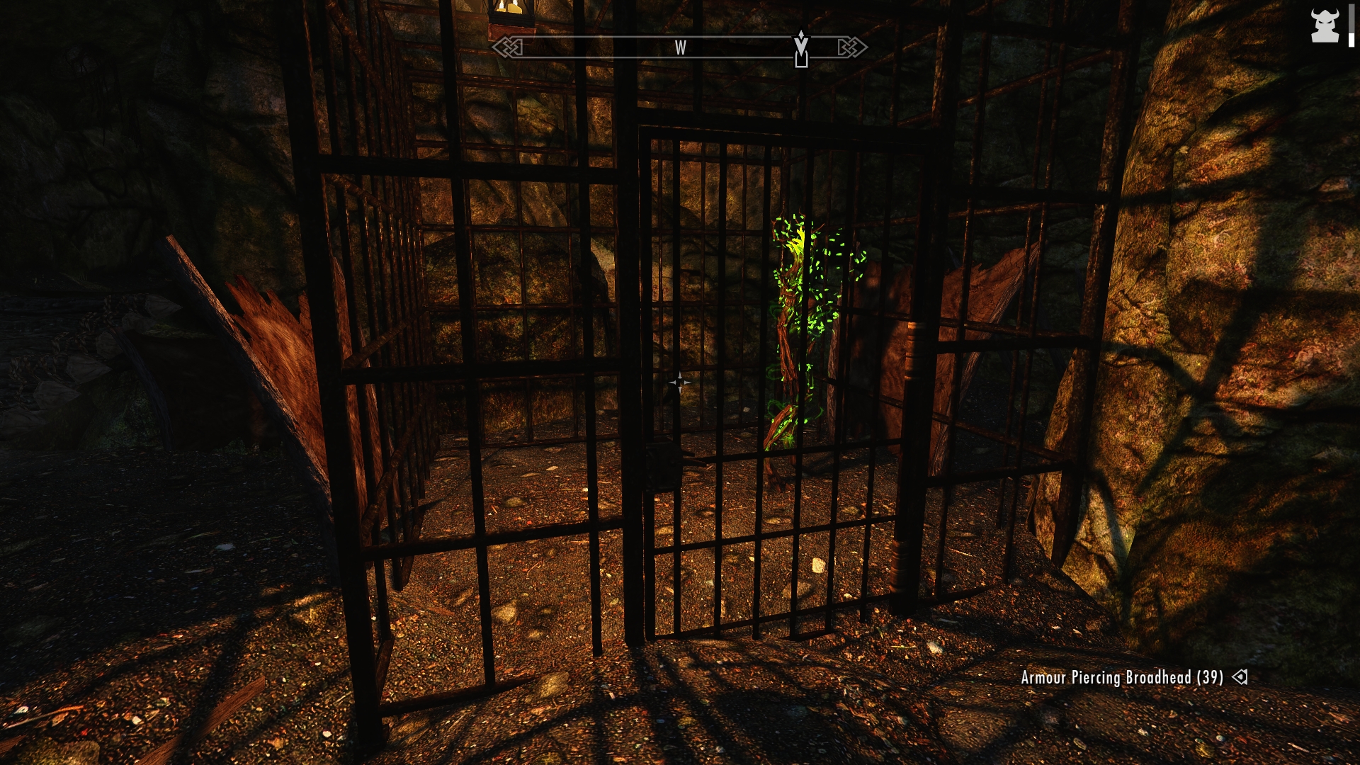 Finally I tell Jenassa to lower her weapons while I open the cage door. We’ll give the spriggan a chance to escape without resorting to violence. By my wife’s expression, I can tell that she’s skeptical about the wisdom of this plan, but she’s willing to humour me. First I make sure that the spriggan notices I’m sheathing my weapons, then I approach the cage door slowly in order to pick the lock. As the door swings wide, I step back, motioning to Jenassa to do the same.