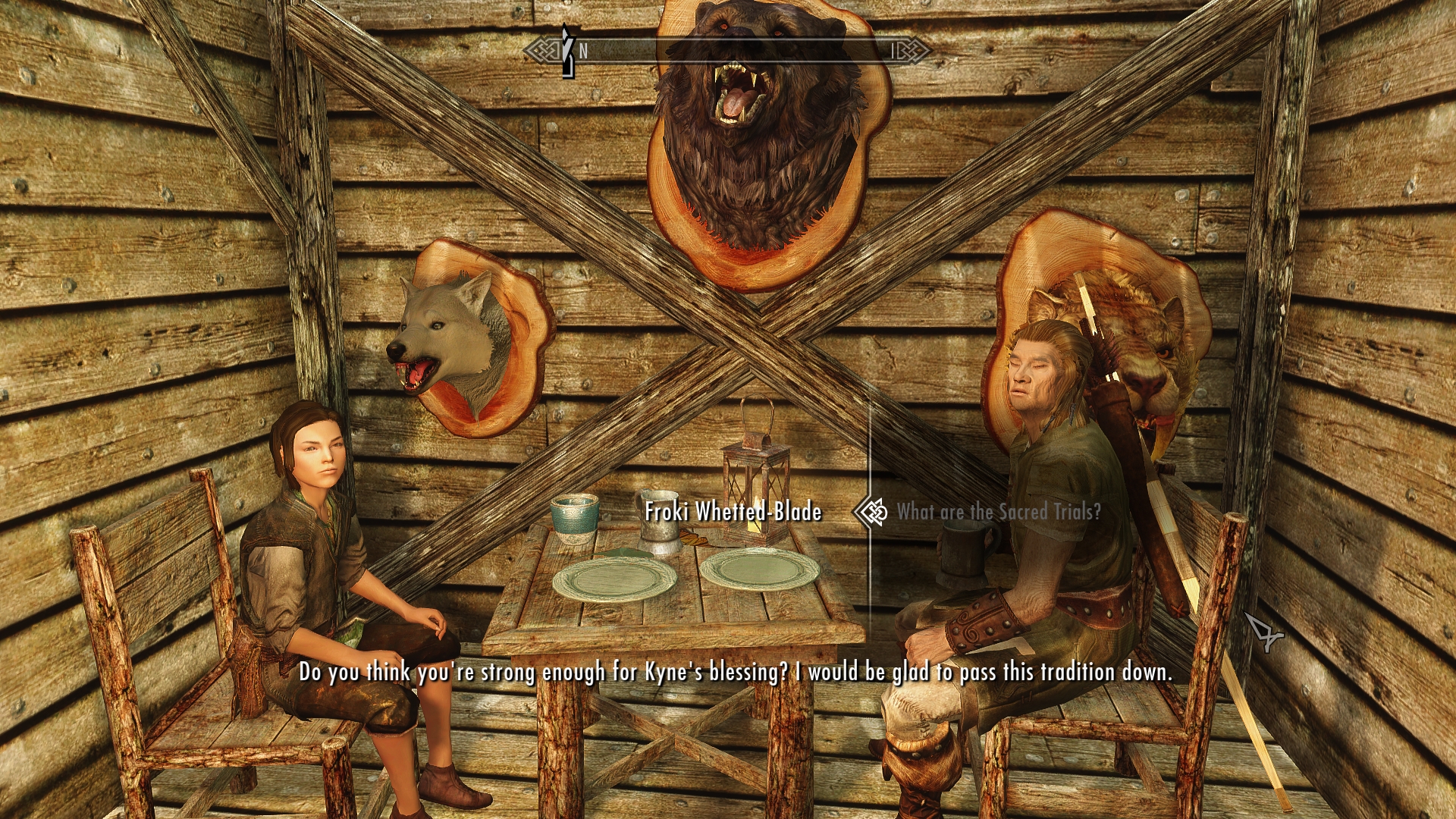 The man seems to be grateful for the return of his bow, and offers to teach me about the Sacred Trials of Kyne.  Noticing my confusion, he reveals that Kyne is an ancient name for the goddess Kynareth.  Apparently there used to be a series of challenges that every dedicated Nord hunter undertook in order to receive the deity’s favour.  I’m about to demur when I realize that he’s trying to repay me for returning his bow — so I decide to humour him and accept his offer, since it seems his pride will have it no other way.  I’m to seek out the guardian beasts of Kyne and hunt them down, in accordance with the old Nord traditions.