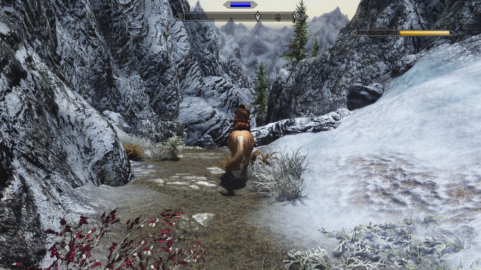 Well, it’s on the way to Whiterun if we take the route through the mountains.  Might as well drop off the ring and deliver the message.  As we approach the snowy pass, I wrap myself in my warm fur cloak and urge my horse to go faster.  The frigid wind is being channeled through the mountains, and it’s almost enough to start my teeth chattering.  Grabbing a bottle of mead, I gulp it down to stave off the bitter cold.