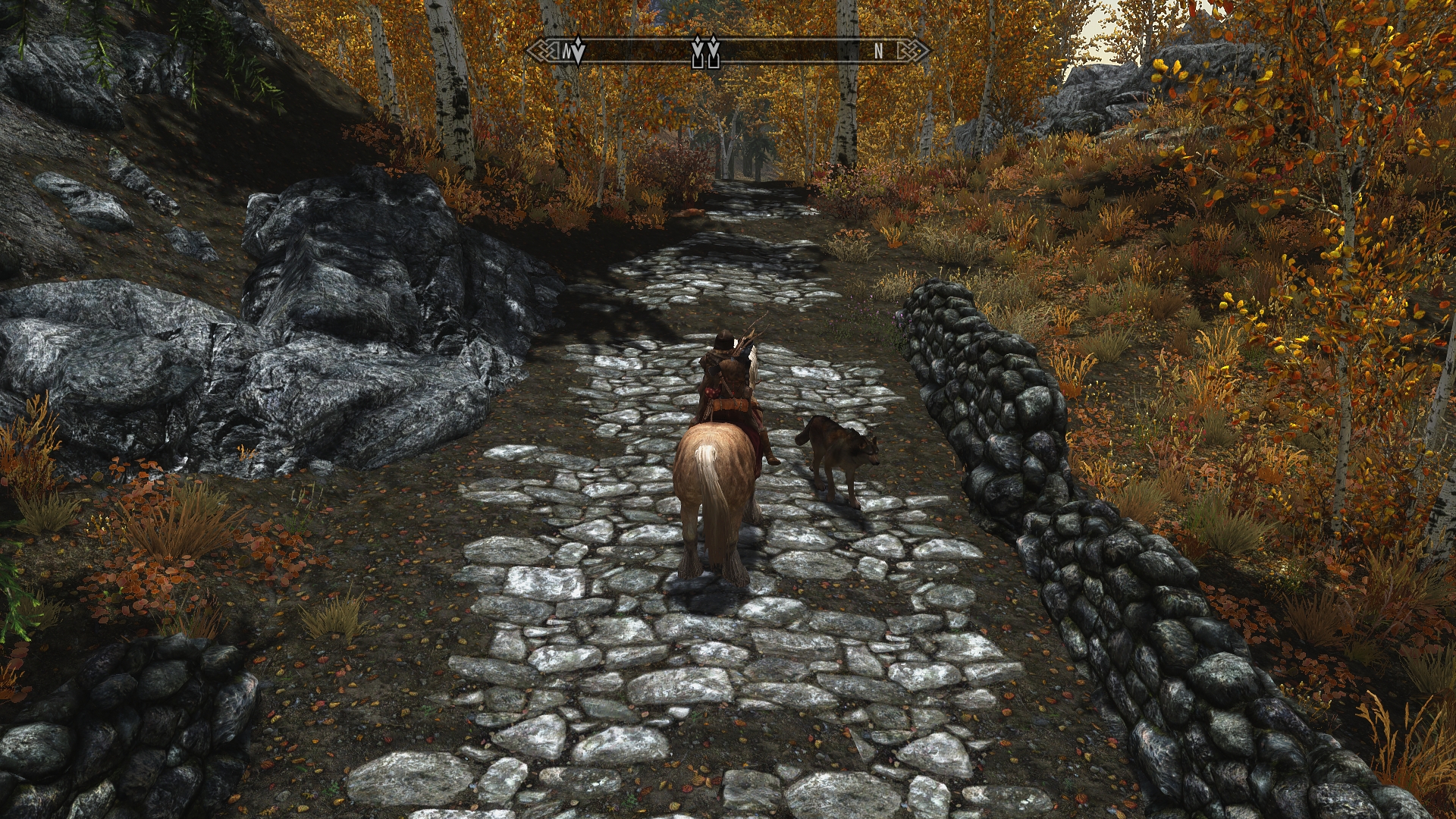 Then as I think about it, I realize that’s not entirely accurate.  We do see a couple of wolves, but it’s like they no longer perceive us as a threat.  Quite the opposite, in fact — they notice us, but they seem quite friendly, almost as if we’re packmates.  I’m hardly upset by this development, but if this is a side effect of becoming a champion of Hircine, it’s strange that I’m only noticing it now.  I try to recall if we’ve been attacked by wolves since Bloated Man’s Grotto, but I’ve encountered so many wolf packs in Skyrim that it’s all one big furry blur.  Shrugging to myself, I decide to just accept it and be grateful for the respite.