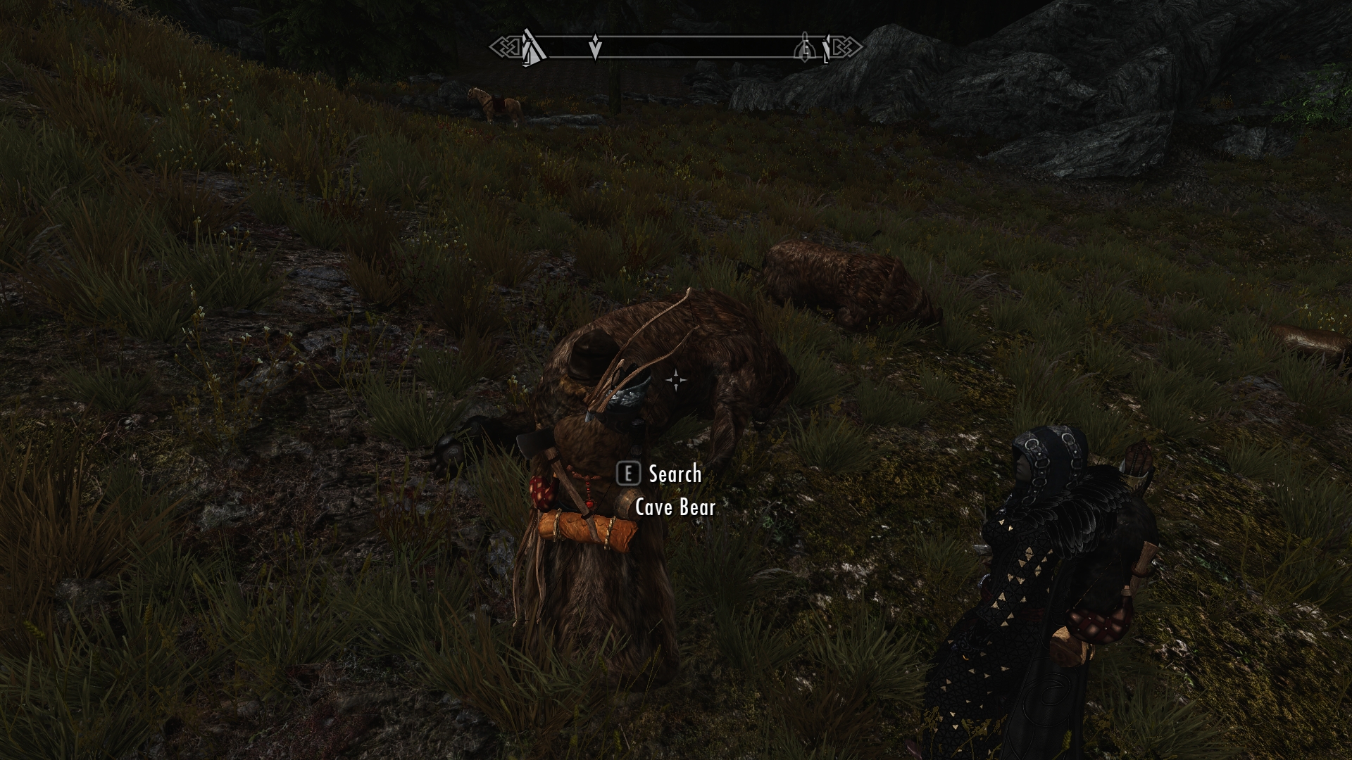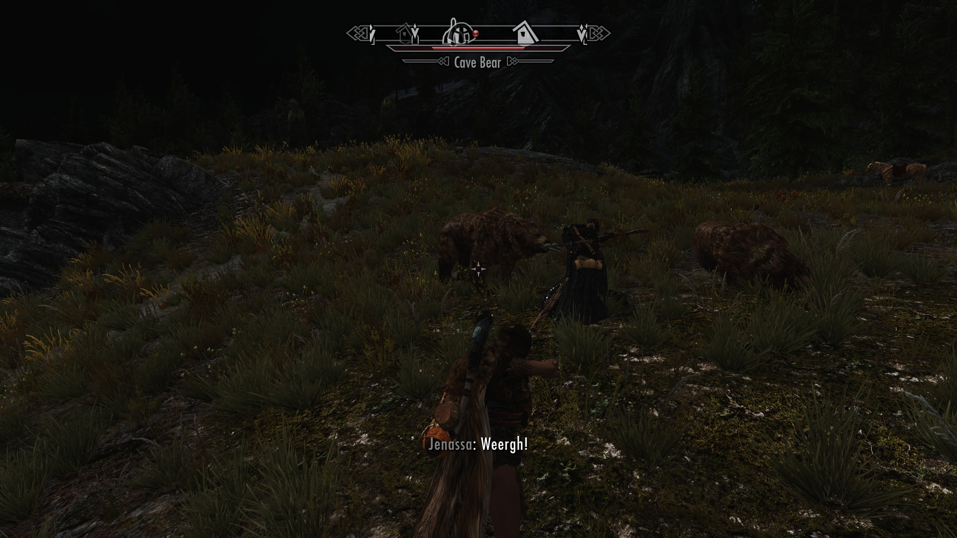 Jenassa and I race toward our horses with the cave bears in hot pursuit, but it’s soon apparent that we’re not going to outrun the bears. Drawing her blades, Jenassa turns and strikes at the nearest cave bear, while I grab my bow and start shooting. With our combined efforts, we manage to take down the first bear fairly quickly, and soon afterward the second beast falls dead at our feet.