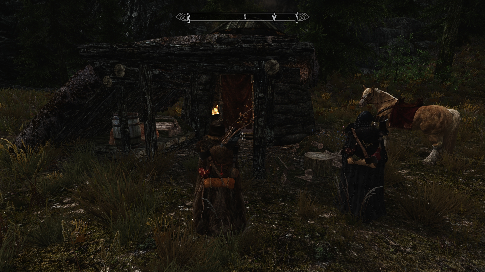 During our fight with the undead, the horses wandered away from the ruins, and Jenassa and I spend some time tracking them down. We discover them standing next to a curious-looking shelter. Containers of food and alchemy reagents are just outside the door, and there even appears to be a warm fire inside, crackling away invitingly. Huh. Maybe we won’t have to pitch a tent tonight after all.