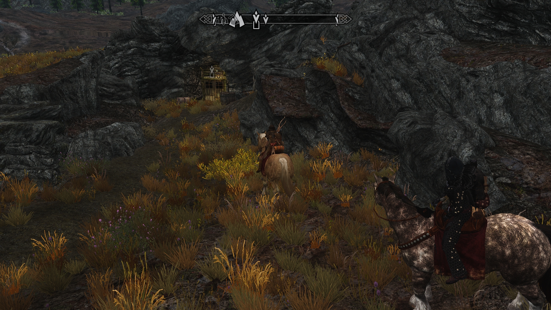 As Jenassa and I ride out from Whiterun, the sun is sinking behind the hills, but there’s still enough light to find our way. We head almost due west through the open fields, taking the more direct route rather than traveling along the roads. While this is somewhat riskier, we’re confident that we can easily outrun any dangerous wildlife as long as we’re on horseback.