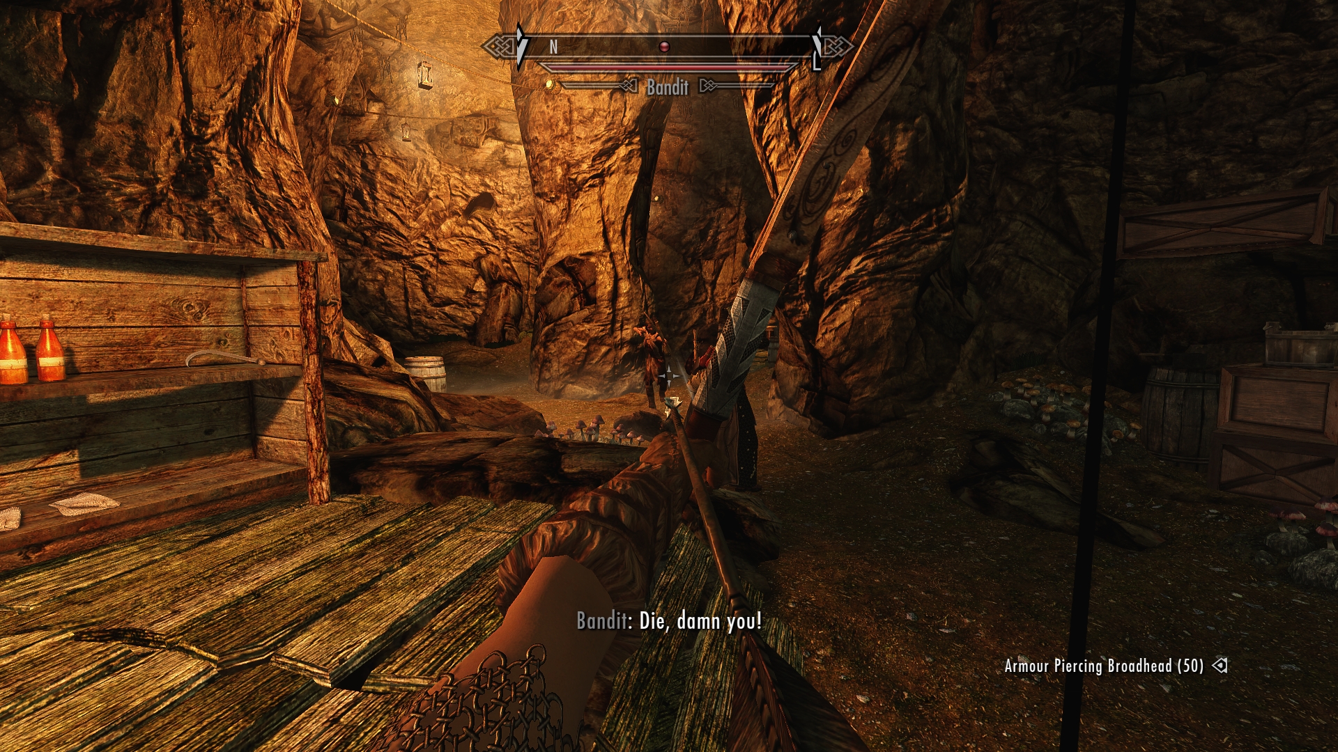 We dismount, reach for our bows, and head inside. Dropping to a crouch, I note that there are several crates and barrels just inside the entrance, full of stolen goods. Apparently Redoran’s gang have been using this hideout for quite some time. The cave is narrow and winding, so it’s difficult to guess how large it is.