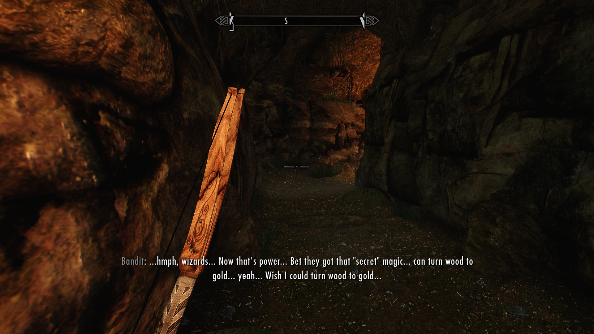 Moving forward a little more, we halt just around a corner from the next room. We make a rough approximation of the bandit’s location from his continued mutterings, and ready our weapons in silence.