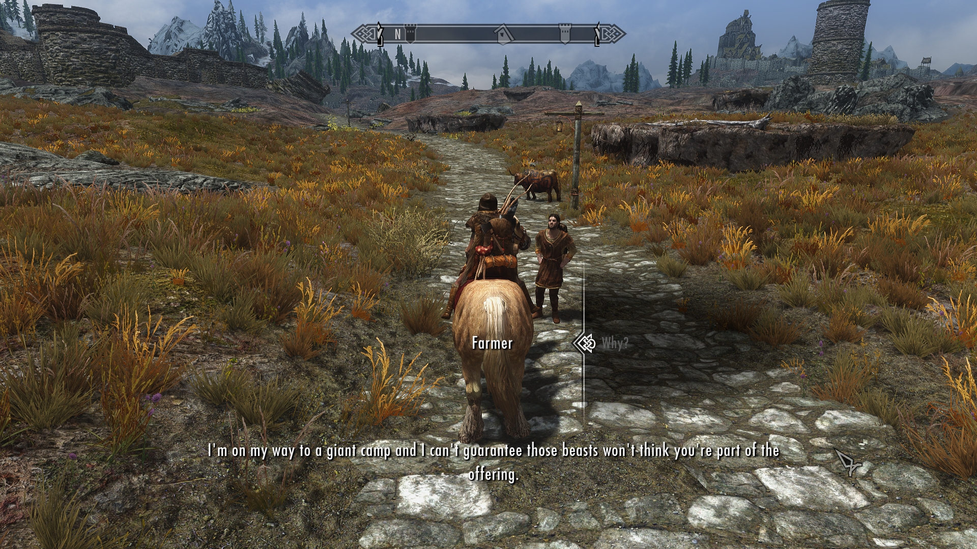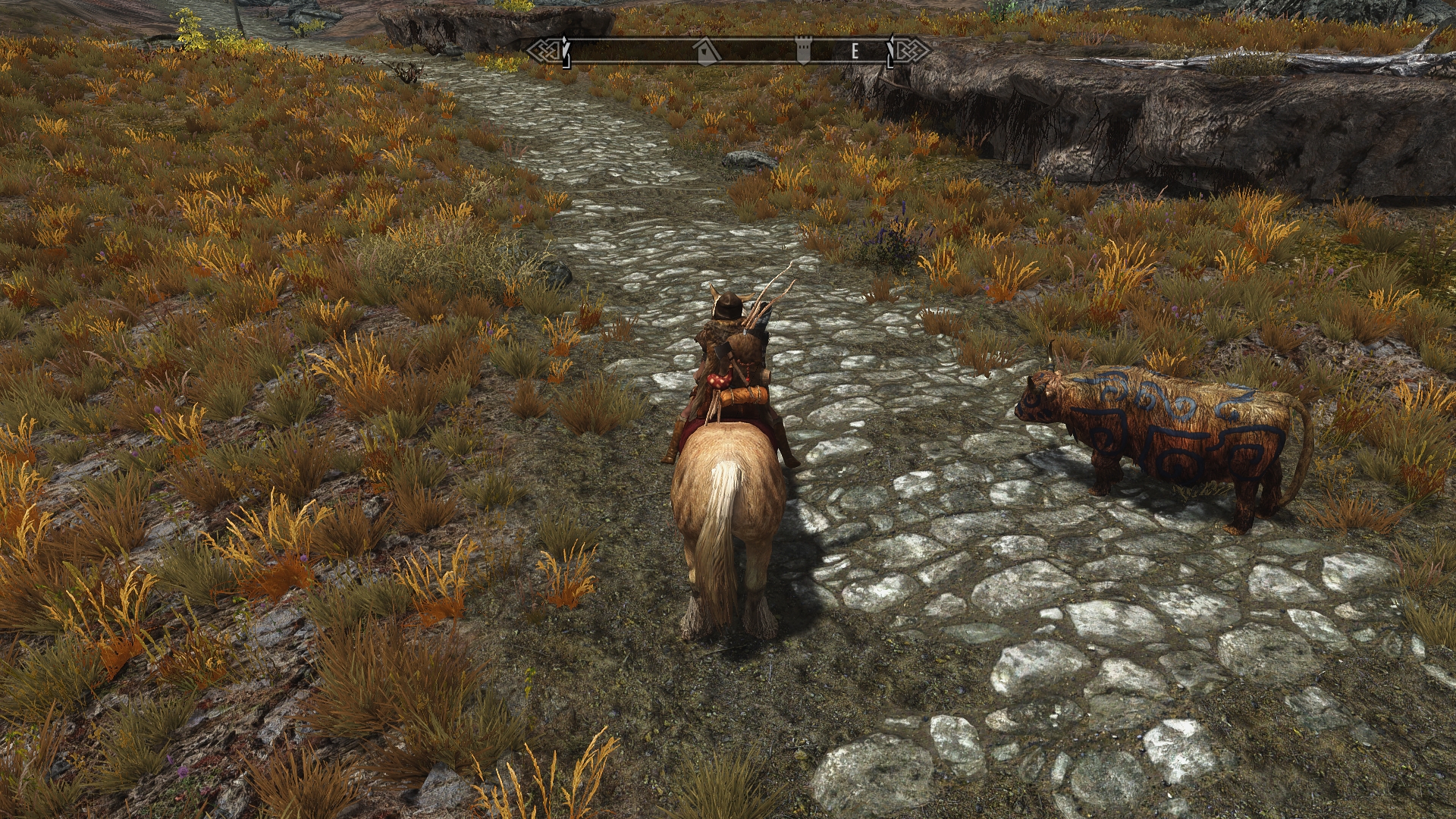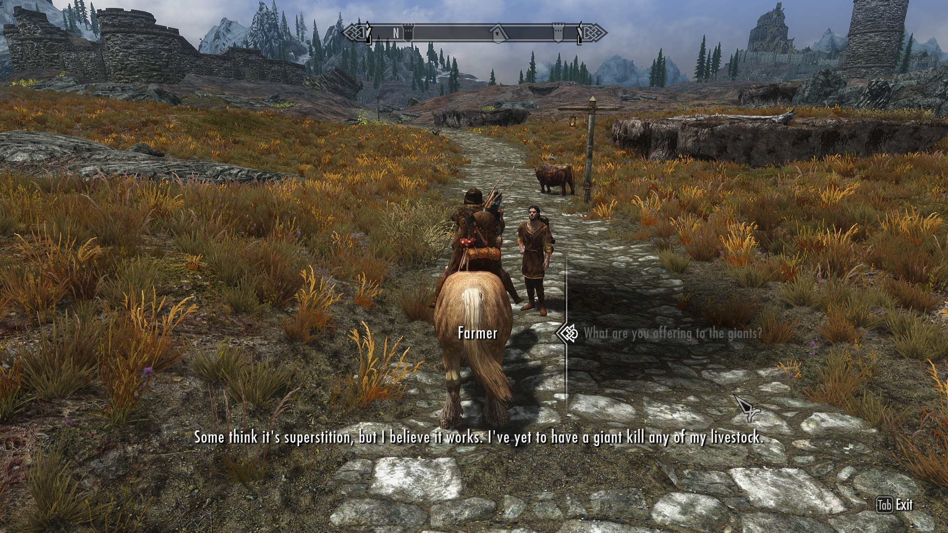 The farmer goes on to explain that it’s an old Nord tradition. It seems that paint on a cow indicates that the farmer is willingly giving it to the giants. And giants apparently understand the meaning behind these swirls and squiggly lines. Right. Perhaps I just have a suspicious mind, but back in my tavern days I heard plenty of “old traditions” that seemed to grow more and more elaborate as the mead kept flowing. It’s not my place to say, but I suspect his mates had a pretty good laugh at this farmer’s expense after the pub closed. Probably sold him the paint to boot.