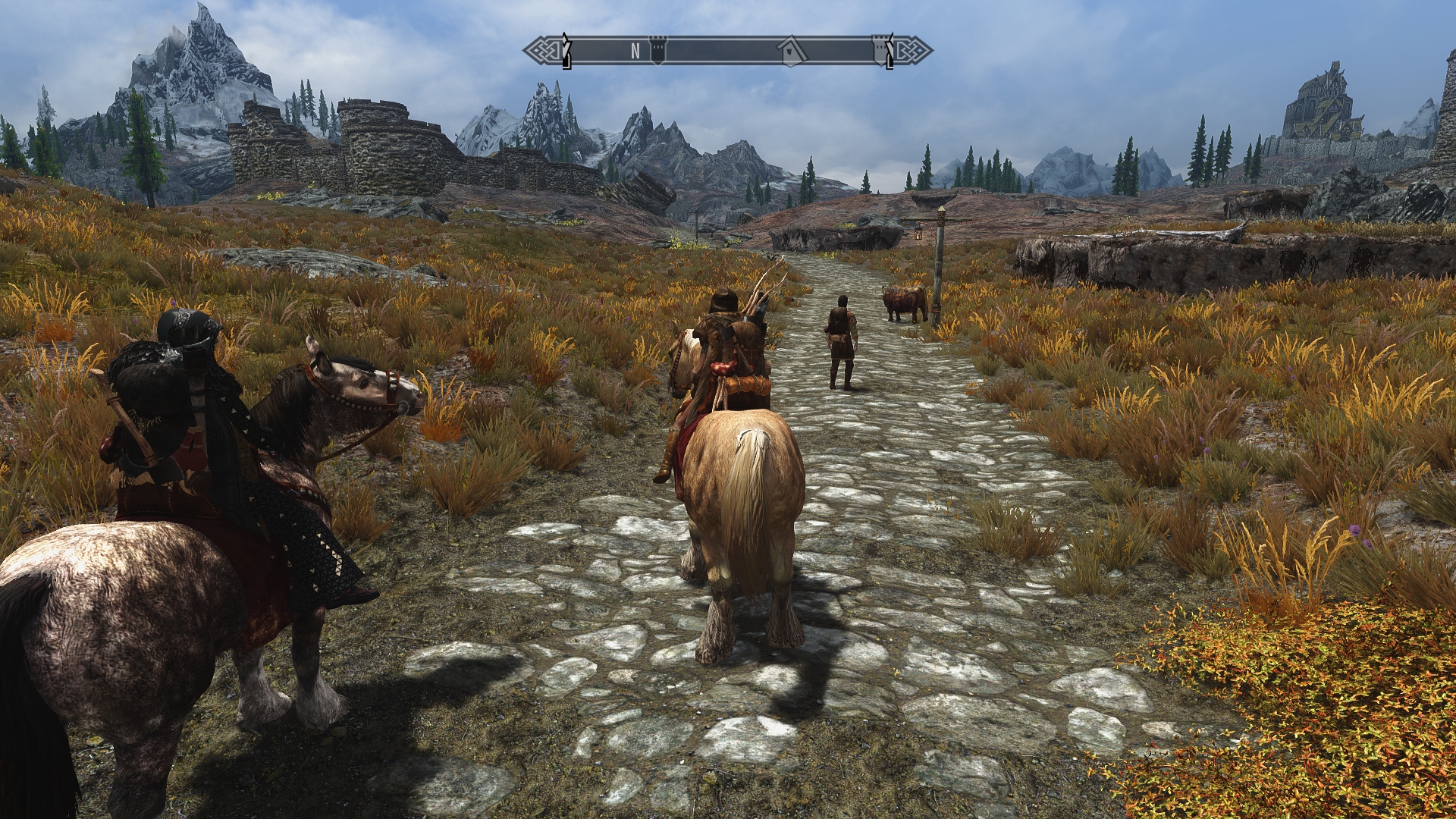 Leaving the farmer behind with his colourful cow, Jenassa and I continue on past the western watchtower. The sunshine is bright and warm, and the breeze carries the scent of wildflowers hidden in the vast expanse of golden grasses. As we ride past the outlying farms clustered around Whiterun, I grab a few edibles from my pack and enjoy a hearty lunch on horseback.