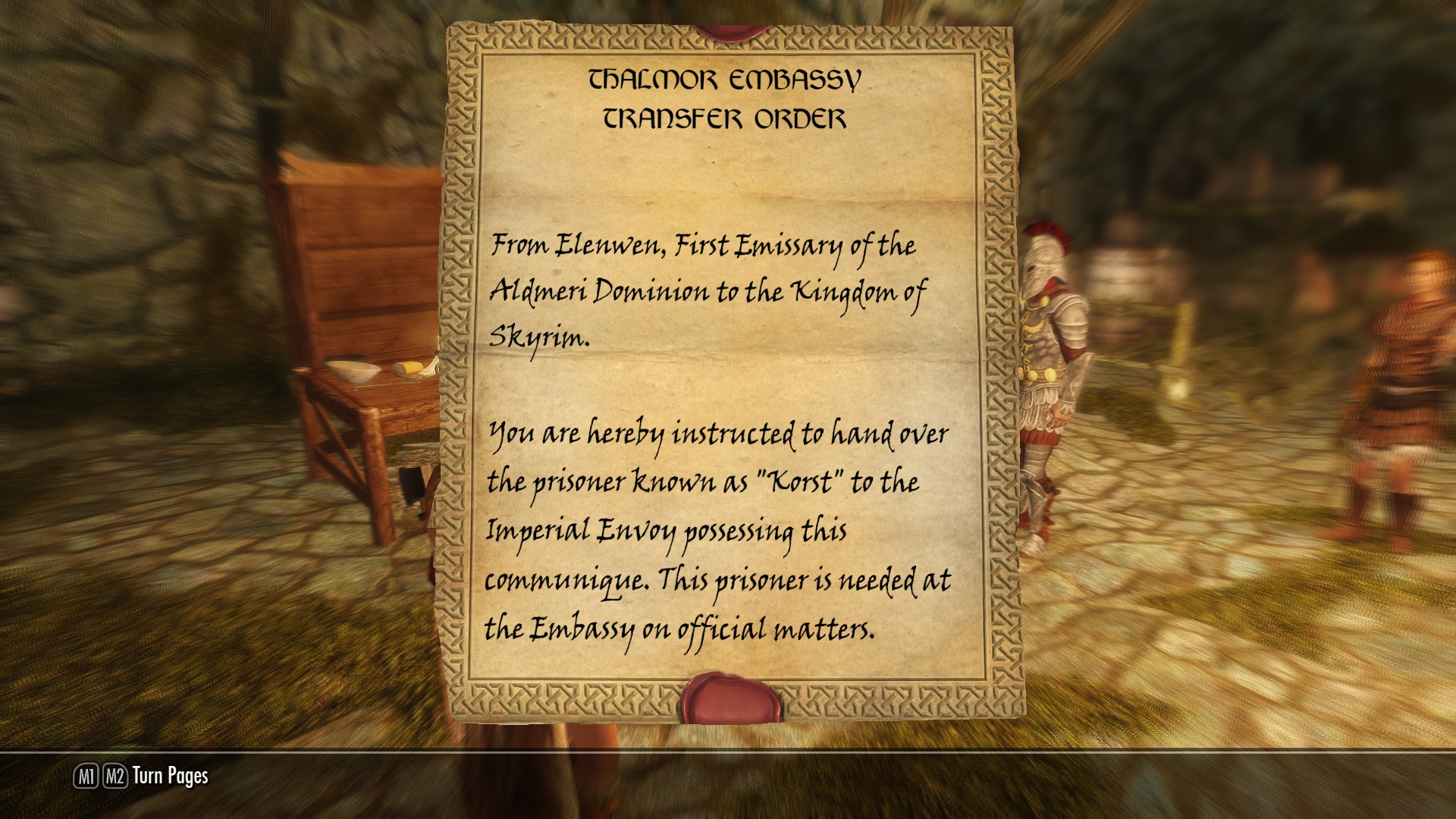 As I’m inwardly seething over my predicament, Valerius goes on to explain that his soldiers happened to find some samples of the Thalmor ambassador’s handwriting scattered around the keep when they arrived. Using these samples, they’ve forged an official-looking letter to lend an appearance of authenticity to the mission. I glance at the paper I’m handed — and although I hate to admit it, they’ve done a good job. It seems they’ve thought of everything. I’m feeling a little more optimistic about our chances — but I can’t say I’m anxious to get started.